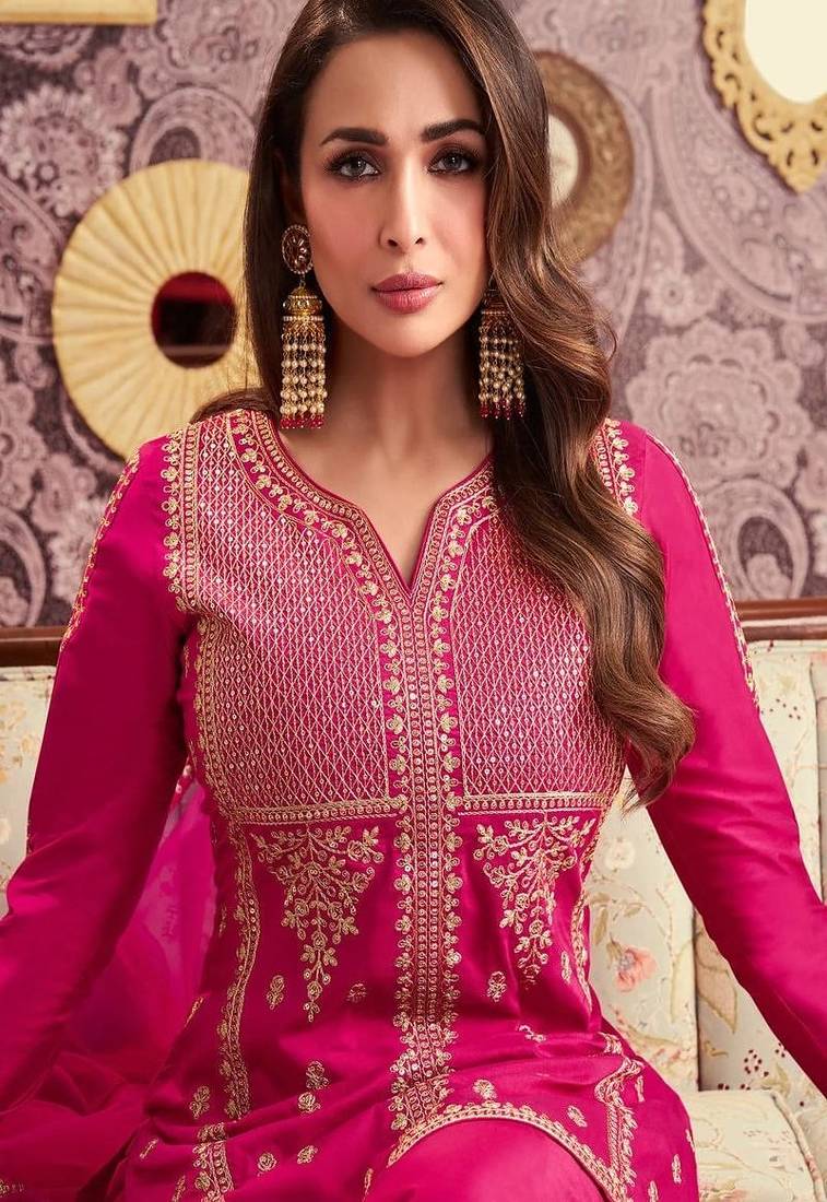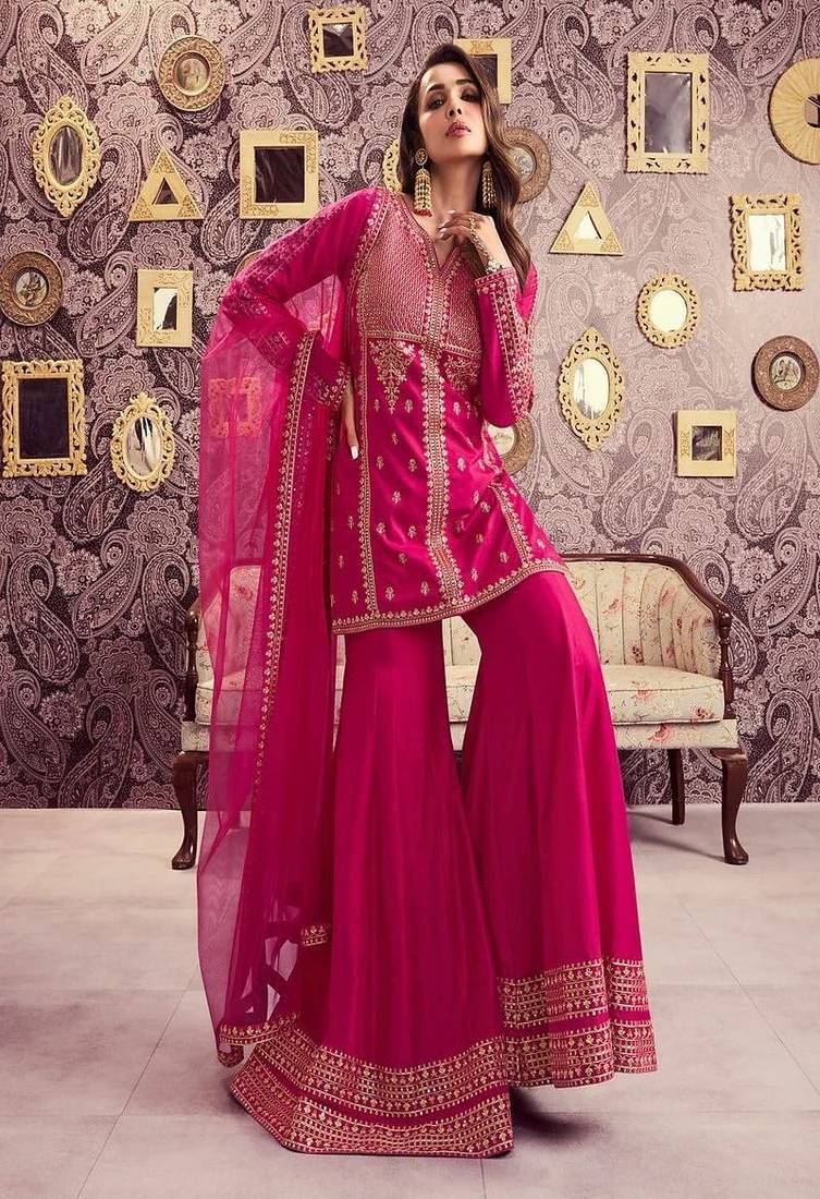 | Product Description | Bold And Striking, This Hot Pink Designer Suit Features Detailed Gold Embroidery Across The Bodice And Sleeves. The Tailored Silhouette Enhances Elegance While Maintaining Comfort. Ideal For Festive Evenings, Receptions, And Grand Celebrations Where You Want To Stand Out Beautifully. |