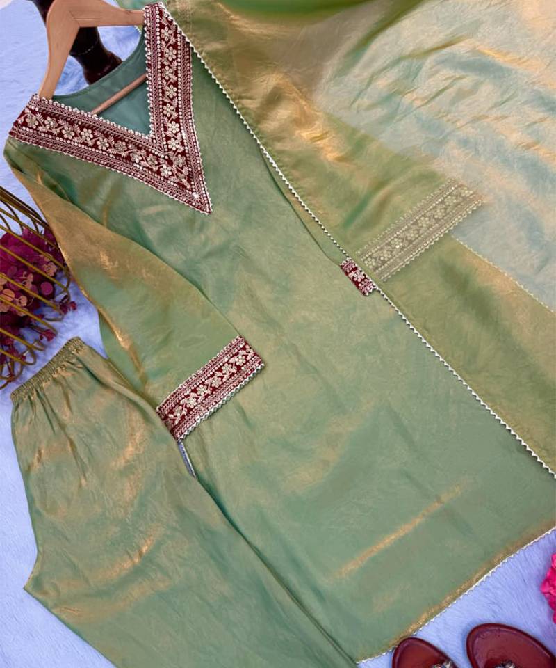 | Product Description | Refresh Your Festive Wardrobe With This Light Green Embroidered Kurta Set. Designed With Detailed Neckline Embroidery, Matching Pants, And A Lightweight Dupatta, It Ensures Both Comfort And Elegance. The Soft Sheen And Refined Craftsmanship Make It Suitable For Celebrations, Traditional Events, And Special Gatherings. |