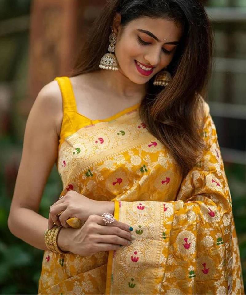 | Product Description | Brighten Any Festivity With This Luminous Yellow Silk Blend Saree. Delicately Woven With Charming Multicolored Floral Butti Patterns And Bordered By Shimmering Gold Zari, This Radiant Garment Perfectly Balances Playful Elegance With Traditional Craftsmanship. Its Highly Breathable Fabric Ensures Maximum Comfort For Haldi Ceremonies And Joyous Daytime Events. |