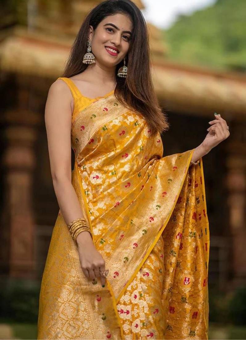 | Product Name | Luminous Yellow Silk Blend Saree With Multicolored Woven Butti | |