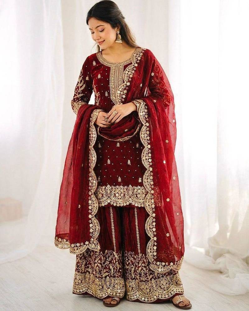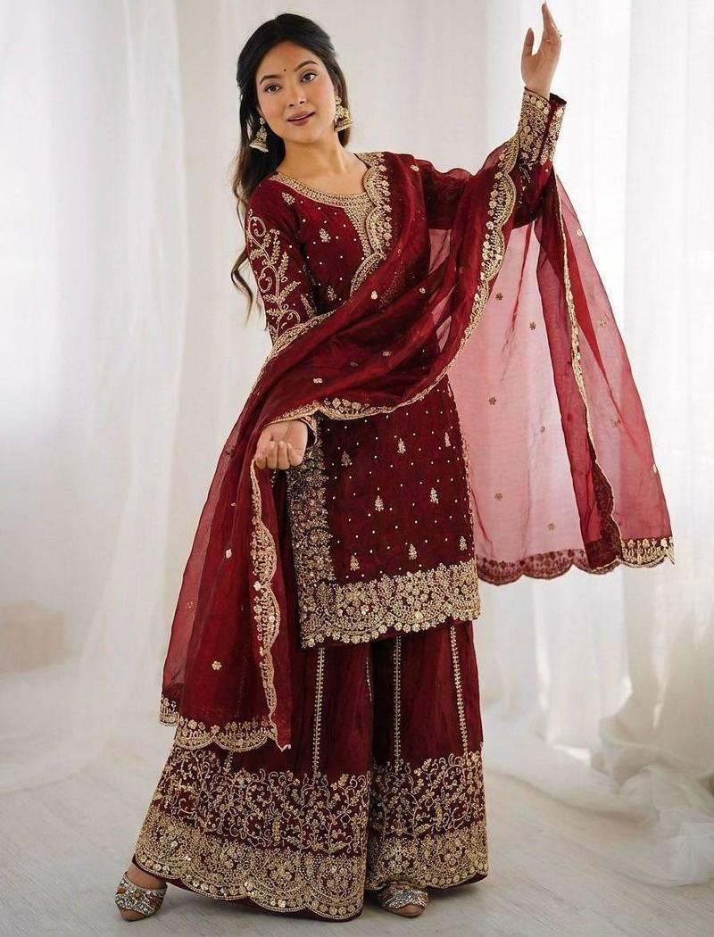 | Product Description | Luxurious Maroon Sharara Suit Featuring Intricate Golden Zari Embroidery On Neckline, Hem, And Dupatta Borders. Paired With A Heavily Embroidered Flared Sharara, This Outfit Radiates Royal Elegance. Perfect For Weddings, Receptions, Sangeet Nights, And Grand Festive Occasions. A Statement Ethnic Piece For Premium Collections. |