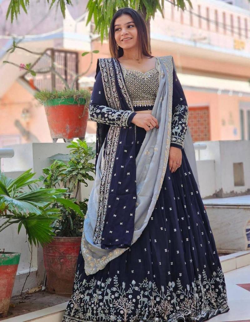 | Product Description | Make A Bold Statement With This Navyb Blue Lehenga Set Adorned With Delicate Silver Embroidery And Paired With A Contrasting Dupatta. Crafted For Elegance And Comfort, It Is Ideal For Evening Functions, Weddings, And Festive Occasions. This Outfit Offers A Timeless Blend Of Classic Color And Modern Ethnic Design. |