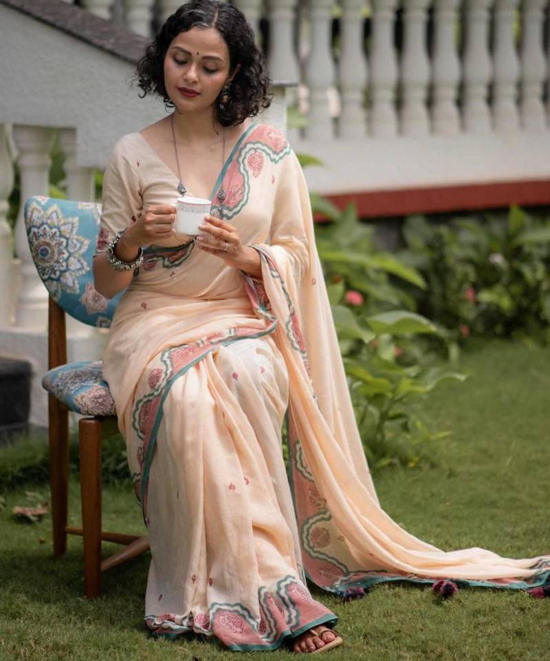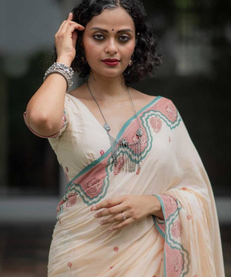 | Product Description | Embrace Understated Elegance With This Cream Toned Cotton Saree, Featuring A Unique Hand Block Printed Scallop Border In Earthy Rose And Teal. The Matching Blouse Piece Completes This Sophisticated Ensemble, Making It A Perfect Choice For Office Wear Or Daytime Gatherings Where Comfort Meets High End Artisanal Craftsmanship. |