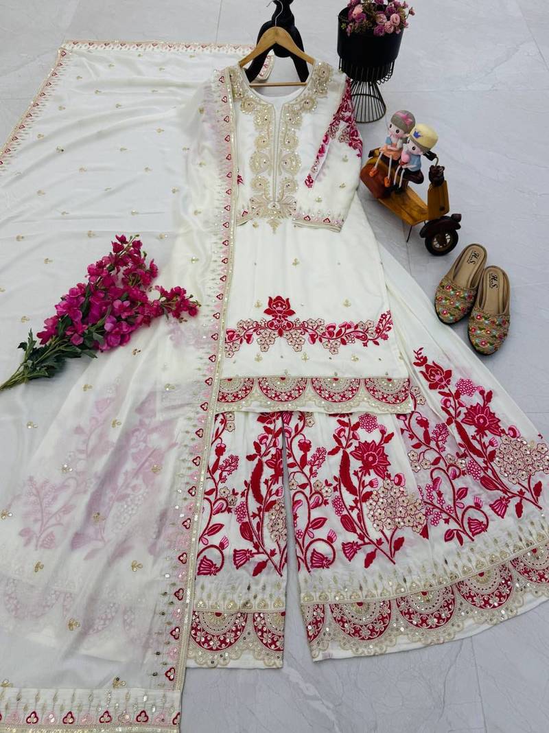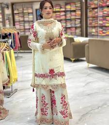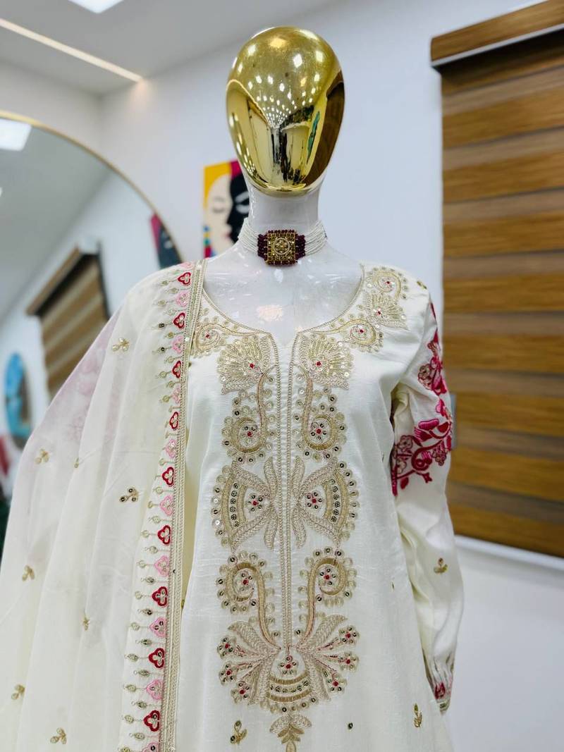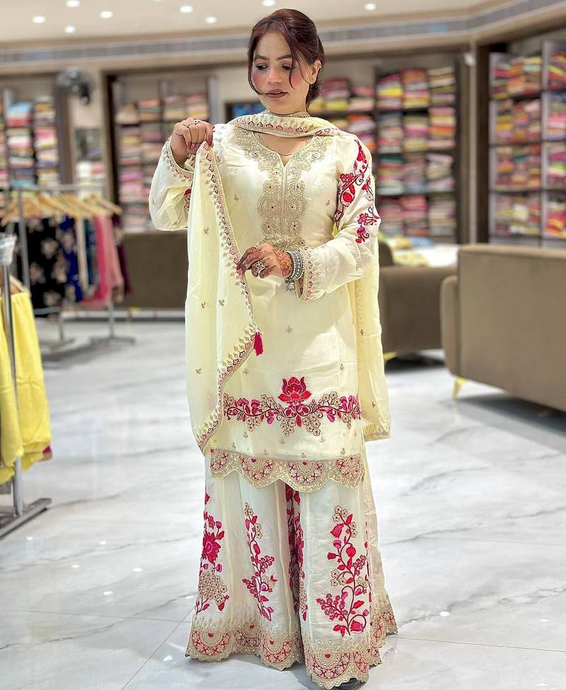 Off-white embroidered tissue silk kurta palazzo set stitched