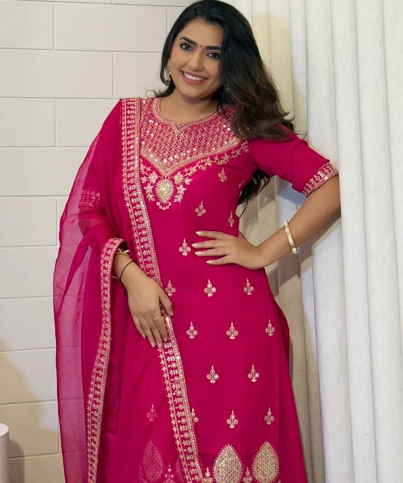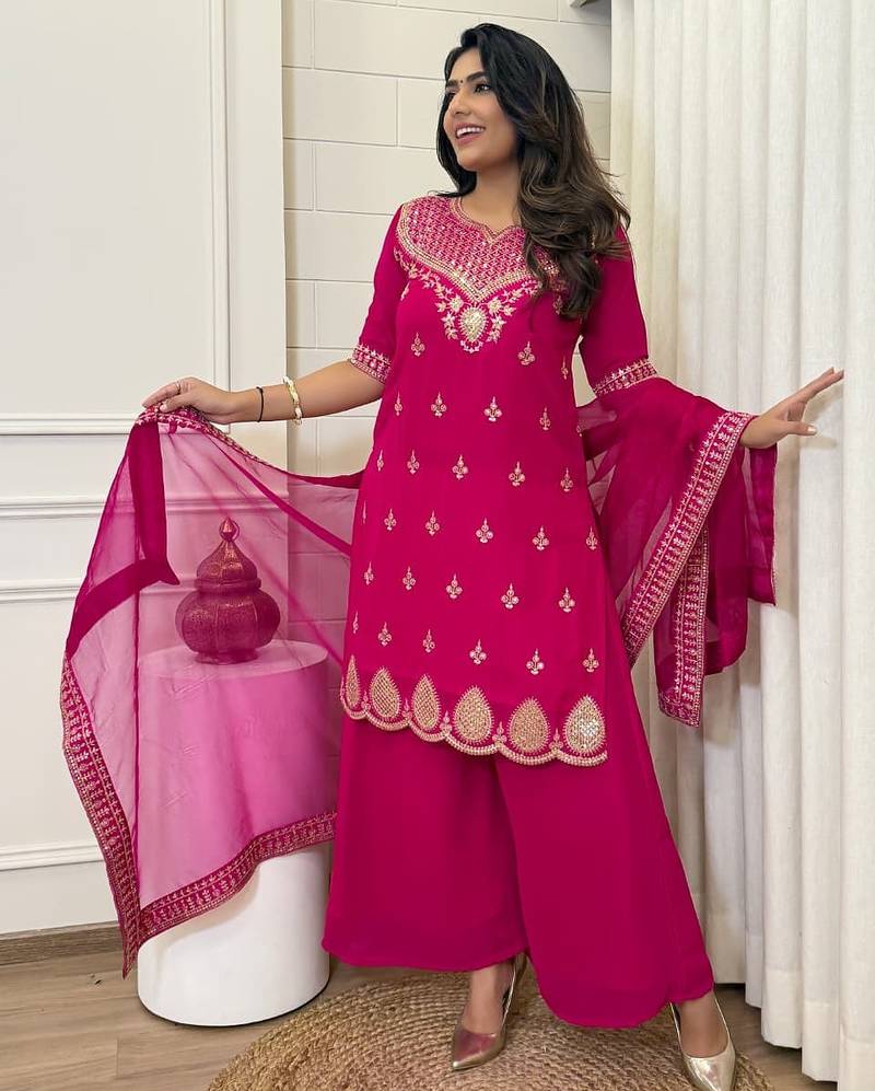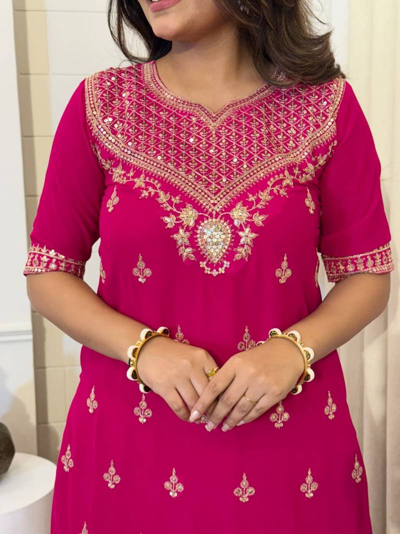 Bold Pink Suit Featuring Heavy Neckline Embroidery And Matching Dupatta. Designed For Wedding Functions And Grand Festive Occasions.