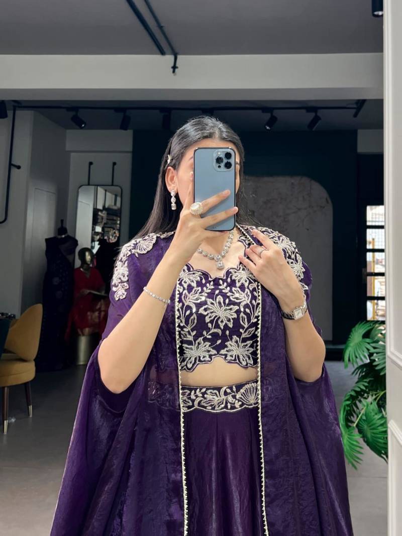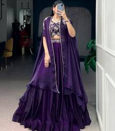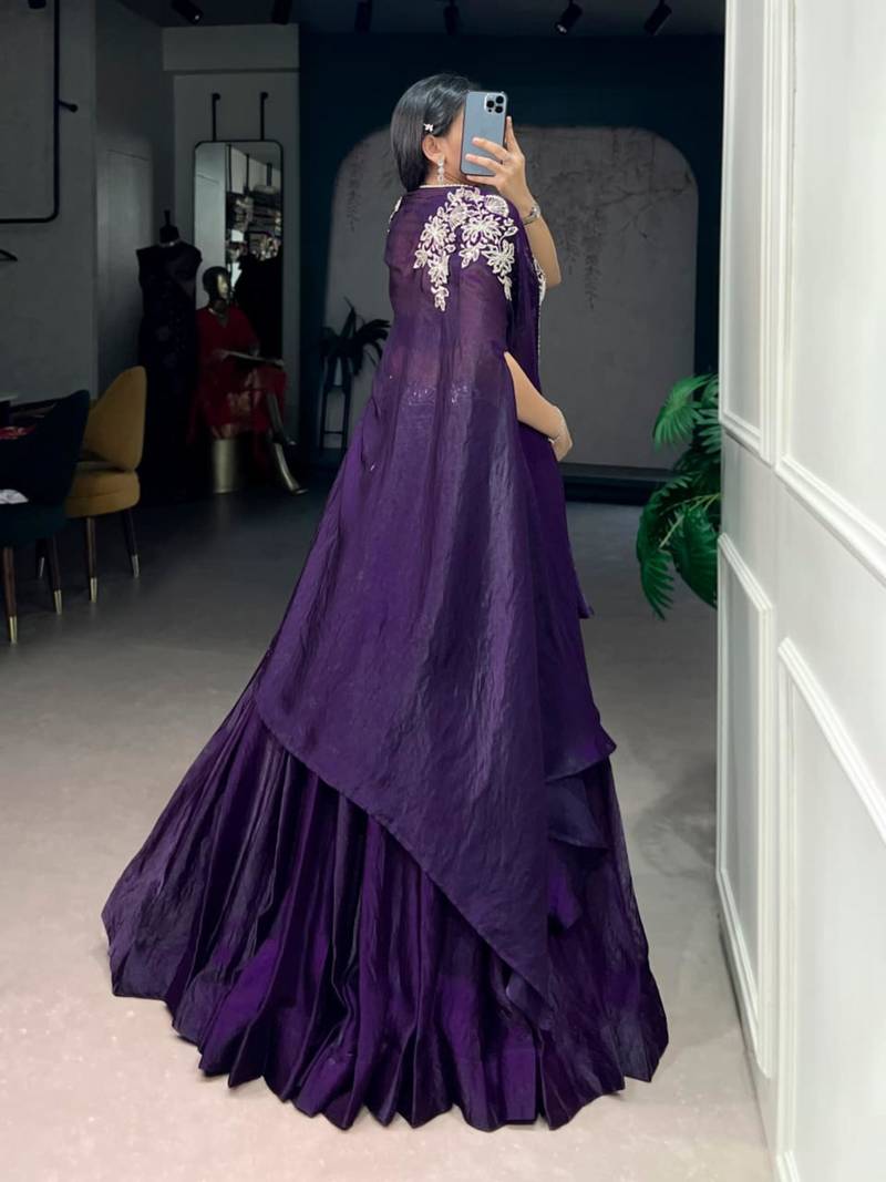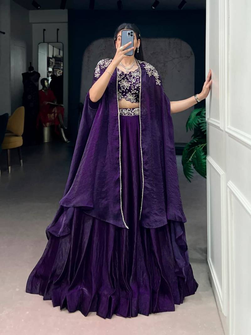 Make A Statement With This Purple Lehenga Featuring A Trendy Cape Style Overlay And Embroidered Blouse. Designed With Premium Fabric For A Flowing Silhouette, It Is Perfect For Weddings, Parties, And Festive Occasions. This Outfit Combines Modern Design Elements With Traditional Elegance For A Bold, Stylish Look.