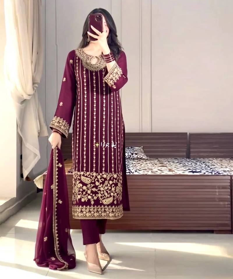 | Product Description | Crafted In A Rich Maroon Shade, This Embroidered Suit Features Intricate Vertical Detailing And An Embellished Neckline. The Coordinated Dupatta Completes The Polished Look. Designed For Weddings, Festive Gatherings, And Evening Occasions, It Balances Comfort With Bold, Traditional Charm. |