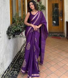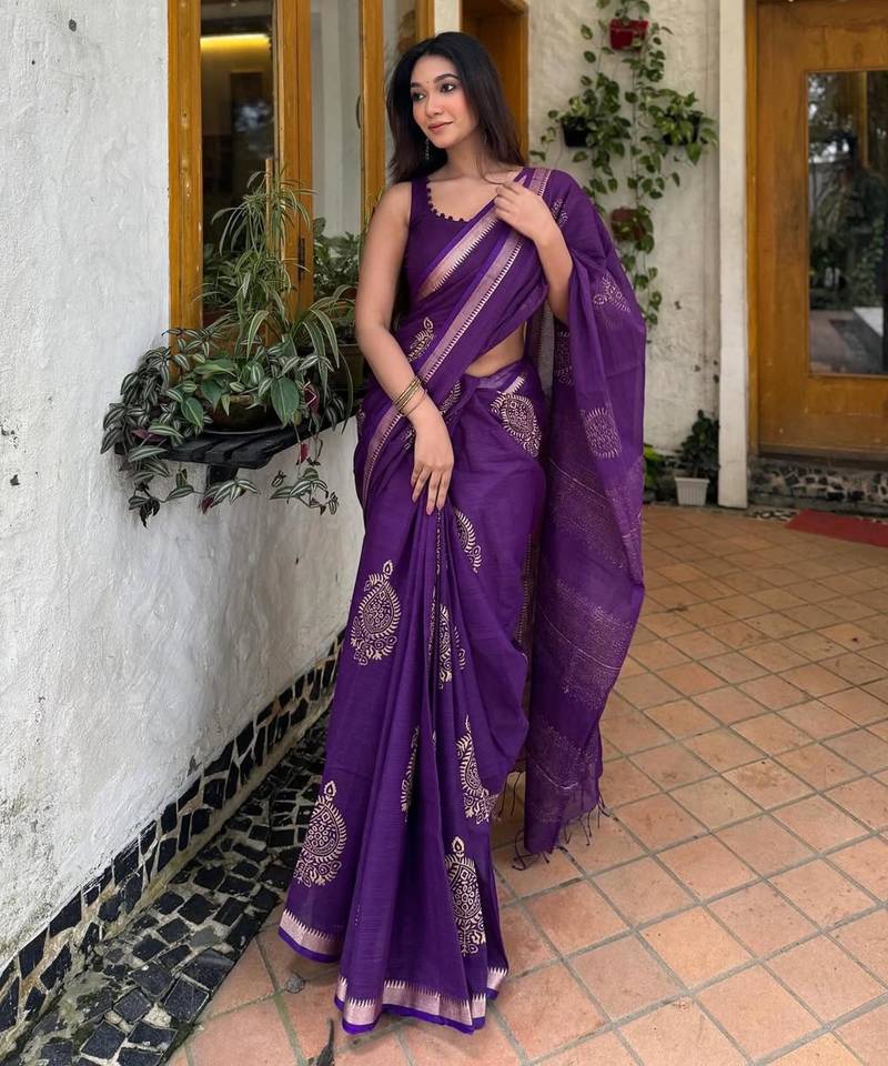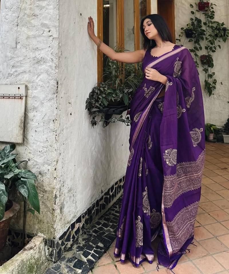 Purple linen block-print saree