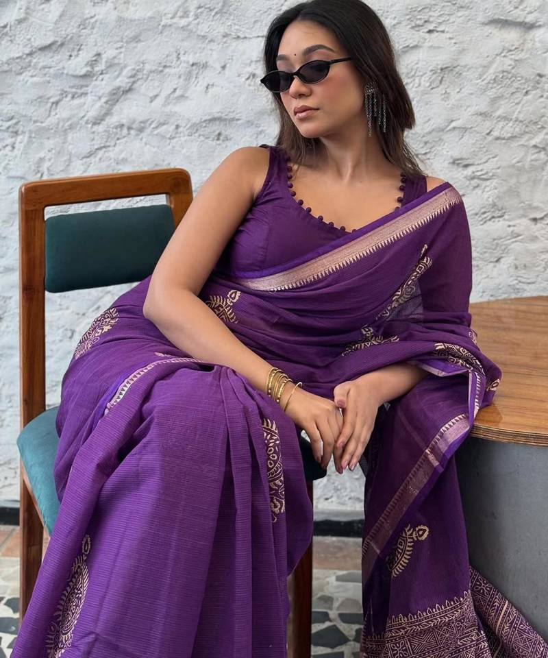 | Product Description | Deep Violet Hues Meet Traditional Gold Toned Block Prints In This Majestic Saree. The Intricate Border And Scattered Motifs Provide A Rich Texture, While The Breathable Cotton Blend Fabric Makes It Suitable For Long Events. This Piece Is A Testament To Timeless Indian Aesthetics, Perfect For Evening Soirées And Formal Functions. |