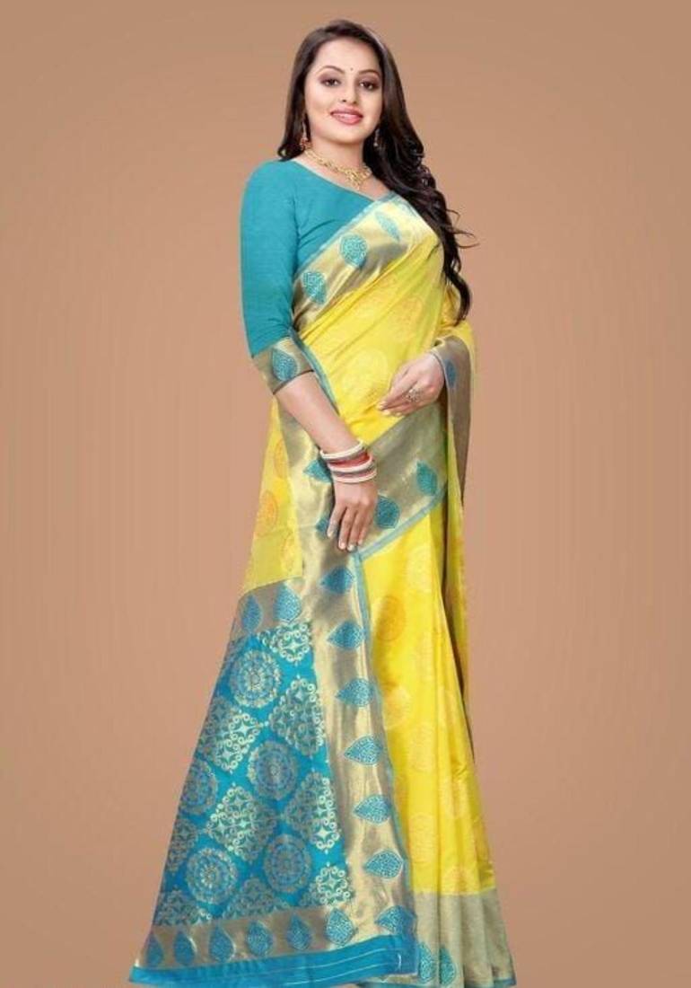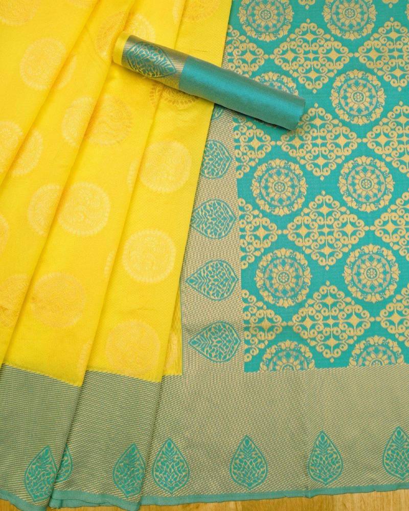 | Product Name | Radiant Yellow Silk Blend Saree With Ornate Teal Border | |