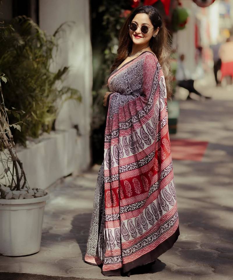Red and black linen paisley motif saree