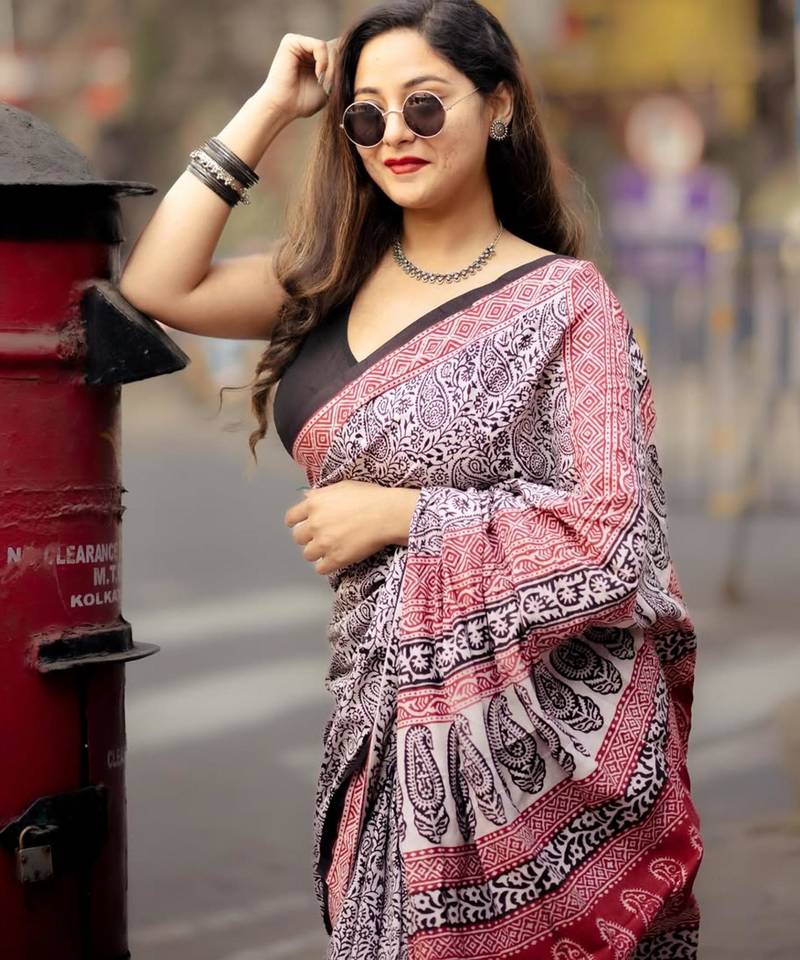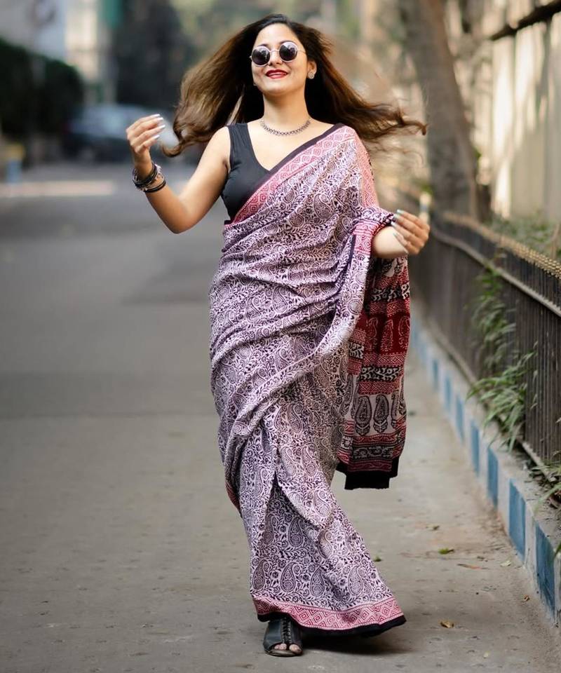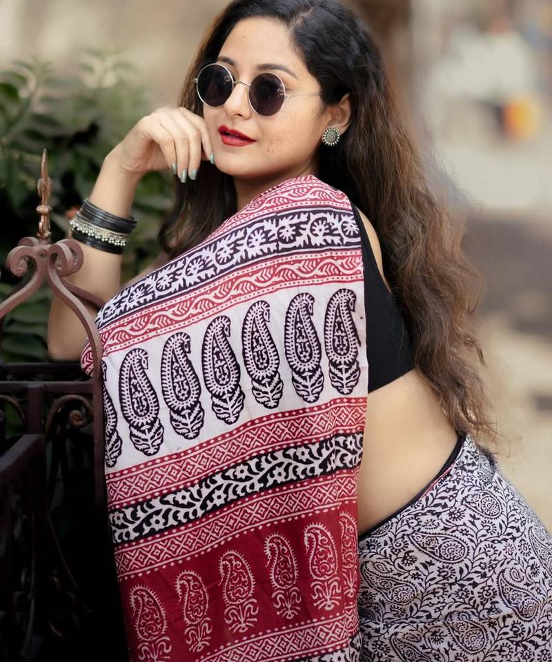 | Product Description | This Striking White And Charcoal Saree Features A Dense Paisley Block Print Accented By A Bold Terracotta Red Border. The Monochromatic Palette Offers A Versatile Styling Canvas, Making It A Staple For Any Ethnic Wardrobe. Pair It With Silver Jewelry To Accentuate The Traditional Hand Printed Details And Classic Aesthetic. |