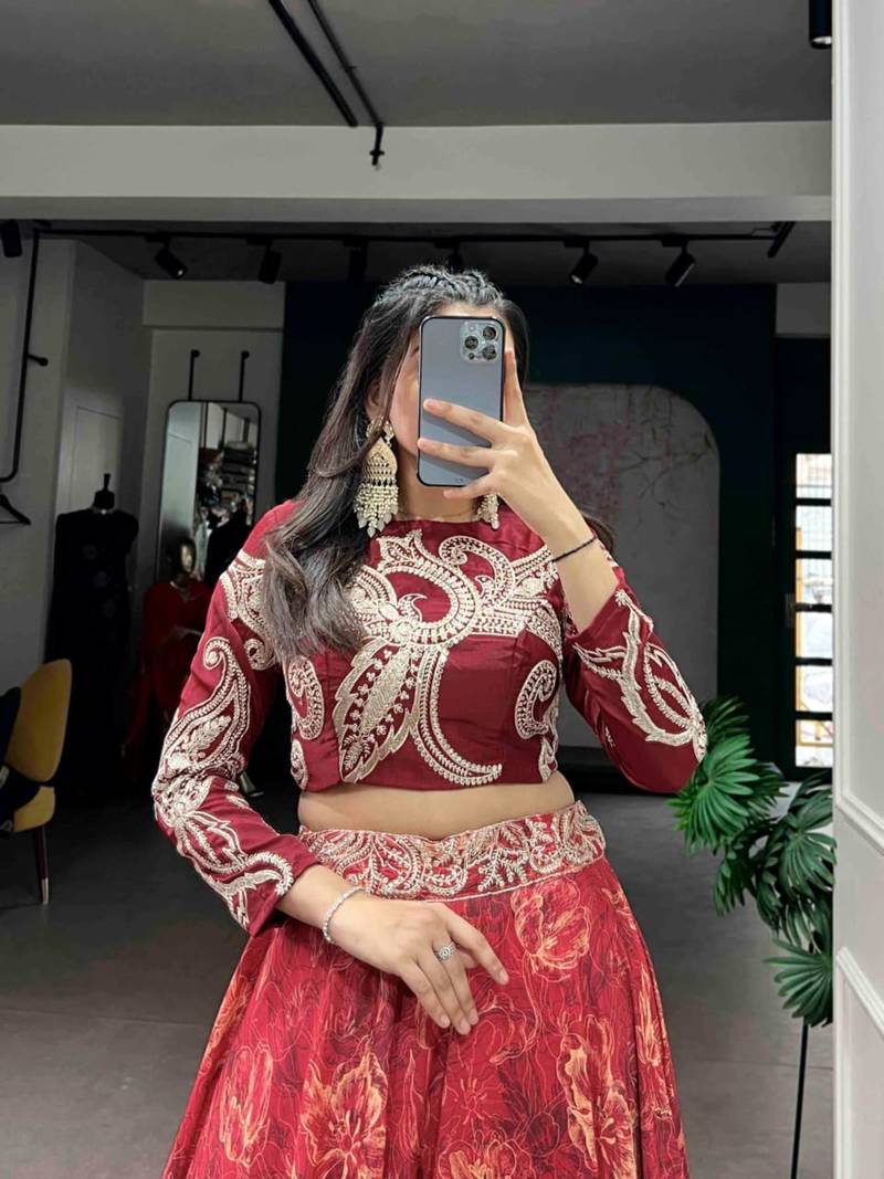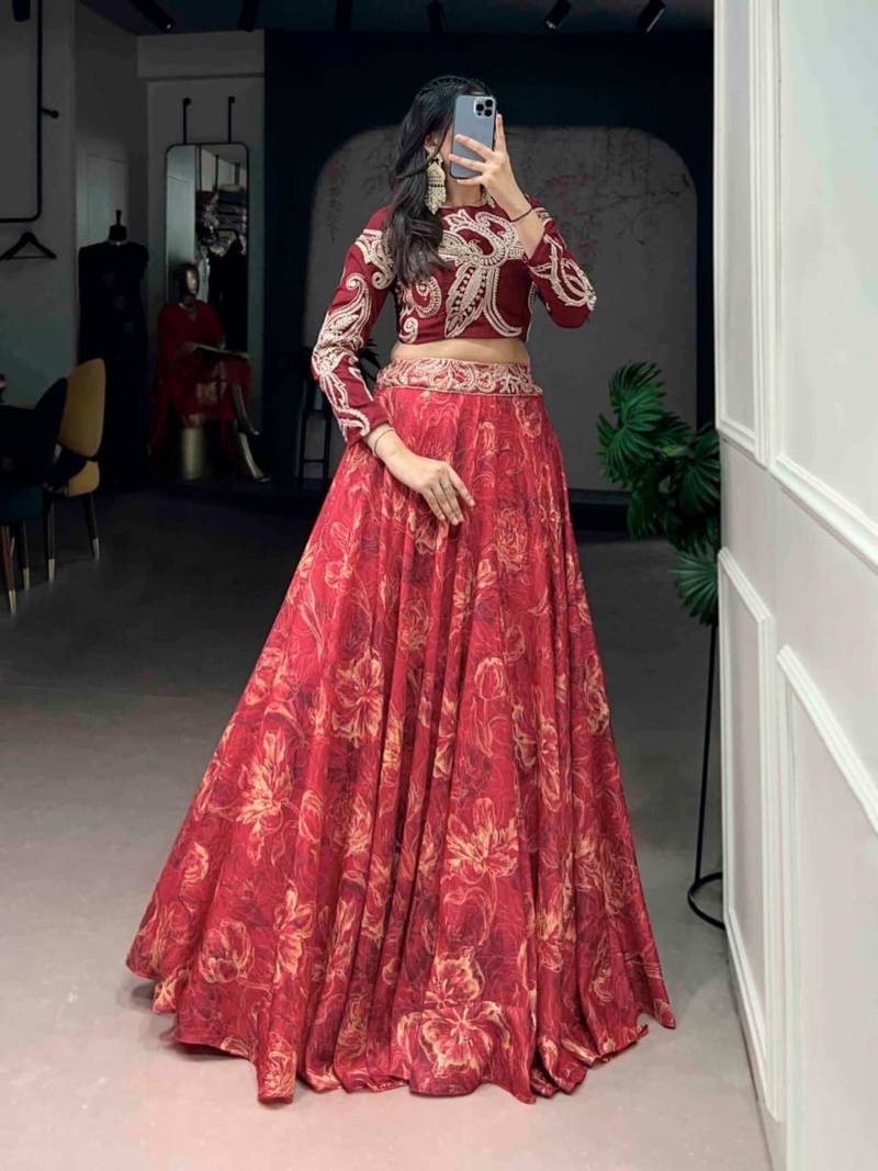 Turn Heads With This Red Floral Lehenga Featuring A Beautifully Embroidered Blouse And Flowing Skirt. Designed With Premium Fabric For Comfort And Durability, It Is Ideal For Weddings And Festive Occasions. This Outfit Blends Vibrant Color With Intricate Detailing For A Bold And Elegant Ethnic Statement.