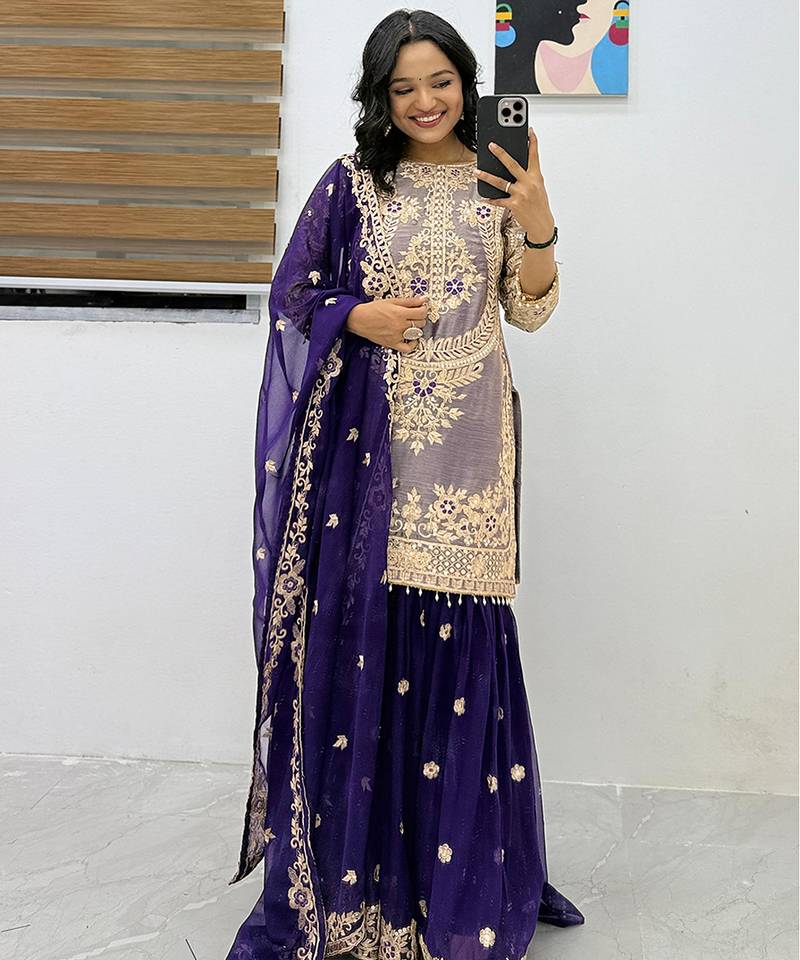 | Product Description | Make A Grand Entrance In This Regal Blue Sharara Suit. The Mauve Toned Kurta Is Enriched With Antique Gold Embroidery And Contrasting Purple Accents, While The Deep Violet Sharara Offers A Voluminous, Dramatic Silhouette. A Sheer Purple Dupatta With Gold Borders Adds The Perfect Finishing Touch To This Luxurious Festive Look. |