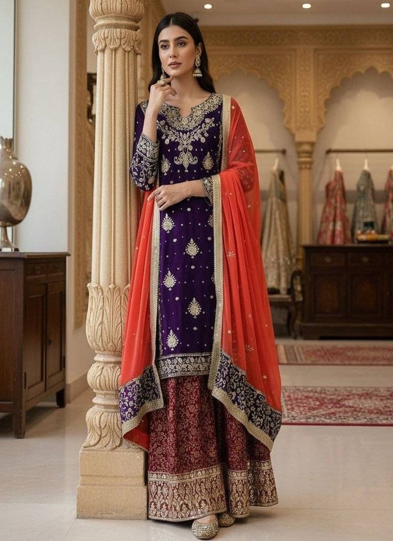 | Product Name | Royal Purple & Red Embroidered Sharara Set | |