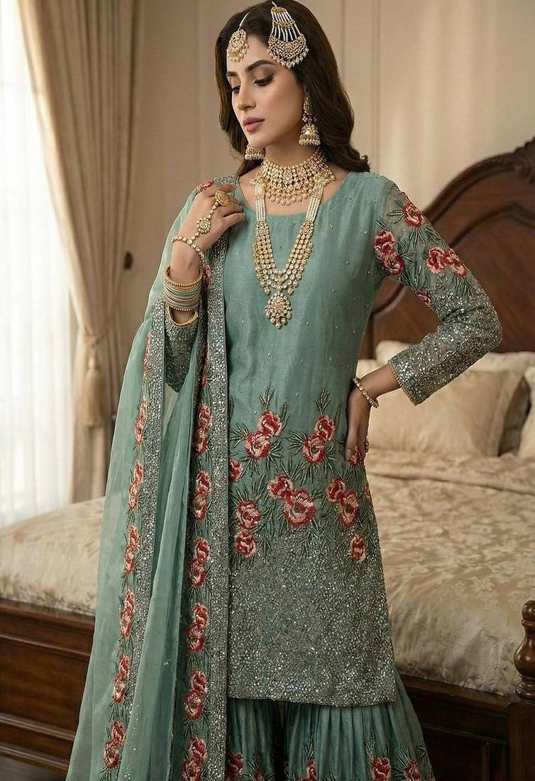 | Product Description | This Sea Green Embroidered Suit Features Intricate Red Floral Detailing And A Flowing Sharara Bottom. The Soft Fabric Drapes Beautifully, While The Embellished Dupatta Adds Charm. Designed For Festive Occasions, This Elegant Set Delivers Comfort, Luxury, And Sophisticated Ethnic Style In One Stunning Outfit. |