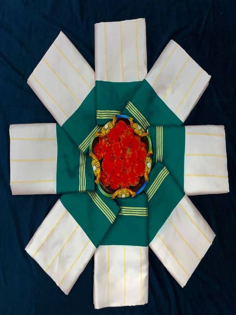 | Product Name | Traditional Cream Green Border Silk Blend Saree | |