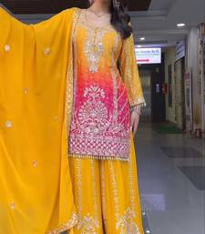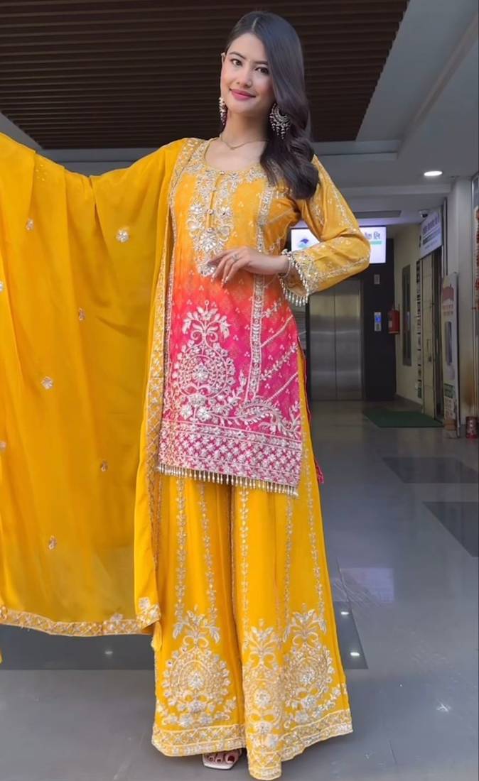 | Product Description | Bright Mustard Yellow Sharara Set With Pink Shaded Kurta Detailing And Heavy Embroidery. The Wide Flared Sharara And Elegant Dupatta Create A Royal Festive Look. Perfect For Daytime Weddings, Haldi Ceremonies, And Celebratory Gatherings. |