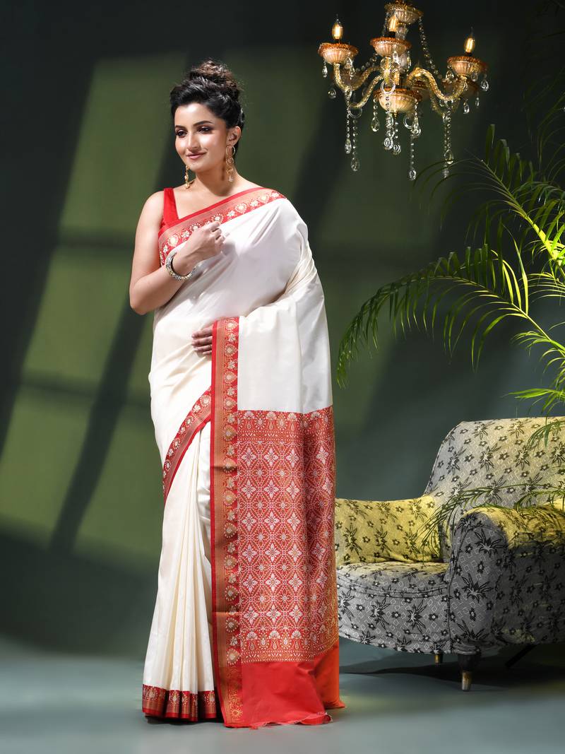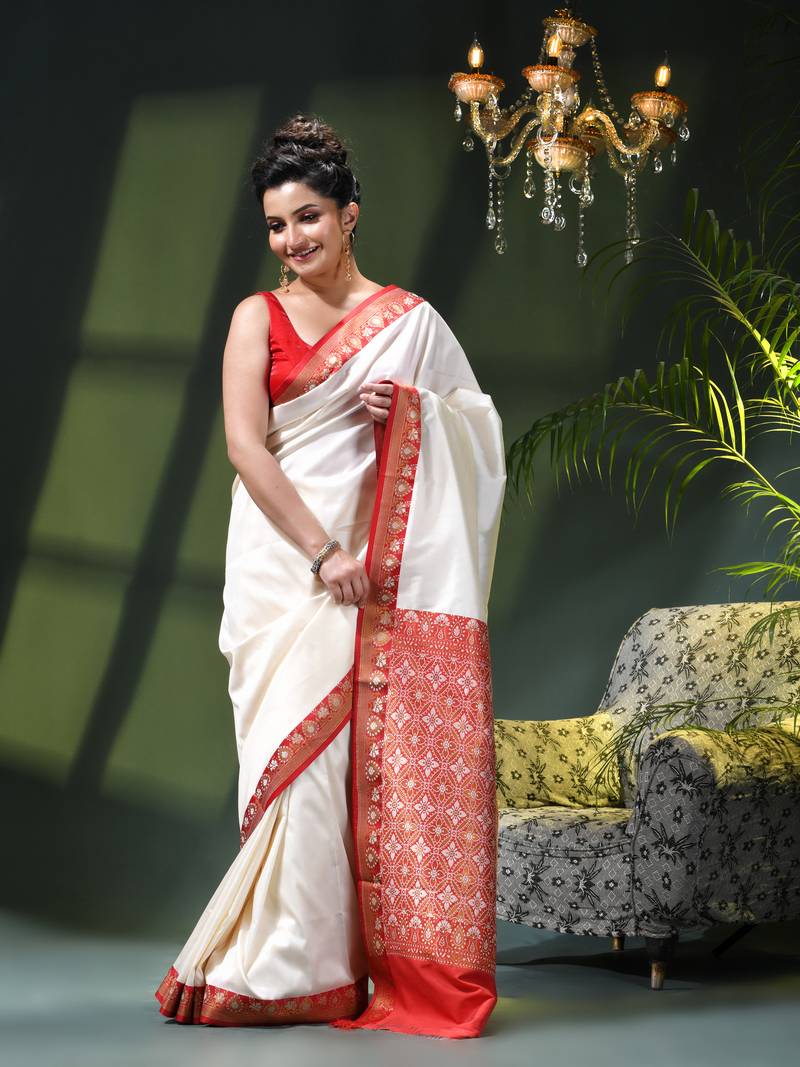 Celebrate Tradition And Devotion With This Exquisite Red White Kanjivaram Banarasi Saree, A Timeless Expression Of Bengali Culture And Festive Elegance. Designed For Auspicious Occasions, This Saree Beautifully Blends The Richness Of Silk Saree Pure Silk With Intricate Banarasi Artistry, Making It Perfect For Puja Festival, Cultural Gatherings, And Sacred Rituals. Crafted With Premium Fabric, This Banarasi Silk Saree Banarasi Soft Silk Saree Offers A Graceful Drape And Royal Finish. The Vibrant Contrast Of Red Saree For Women With Classic White Reflects Purity, Celebration, And Devotion—Ideal For Wedding Function Saree, Saree Party Wear, Farewell Saree, And Saree For Wedding Function. Inspired By Traditional Weaving, This Piece Also Carries The Soul Of A Handloom Bengal Saree, Celebrating Heritage With Modern Finesse. This Saree Belongs To The Silk Sarees For Women Latest Design And Pairs Beautifully With Ethnic Jewelry For A Complete Festive Look. Whether You Prefer Kanjivaram Saree, Pattu Sarees, Mysore Silk Saree, Or Cotton Silk Saree, This Design Stands Out As A Must Have From The New Collection Of Designer Sarees For Women Party Wear. Versatile And Elegant, It Complements Multiple Styles—From Ready To Wear Saree Looks To Classic Drapes. It Fits Seamlessly Into Wardrobes That Love Fancy Saree, Stylish Traditional Sarees For Women, Jamdani Sarees For Women, Paithani Saree For Women, Patola Silk Sarees Latest Design, And Kanjivaram Silk Sarees Latest Design. Perfect For Devotees, Brides, And Festive Fashion Lovers, This Saree Is Part Of The Trending Sarees For Women And A Proud Addition To Wedding Sarees For Women And Sarees For Women Latest Design Collections. A Graceful Blend Of Culture, Celebration, And Craftsmanship—Made To Shine During Every Sacred Moment.