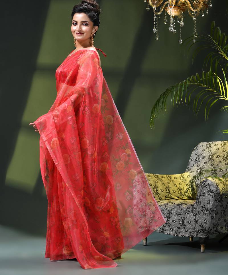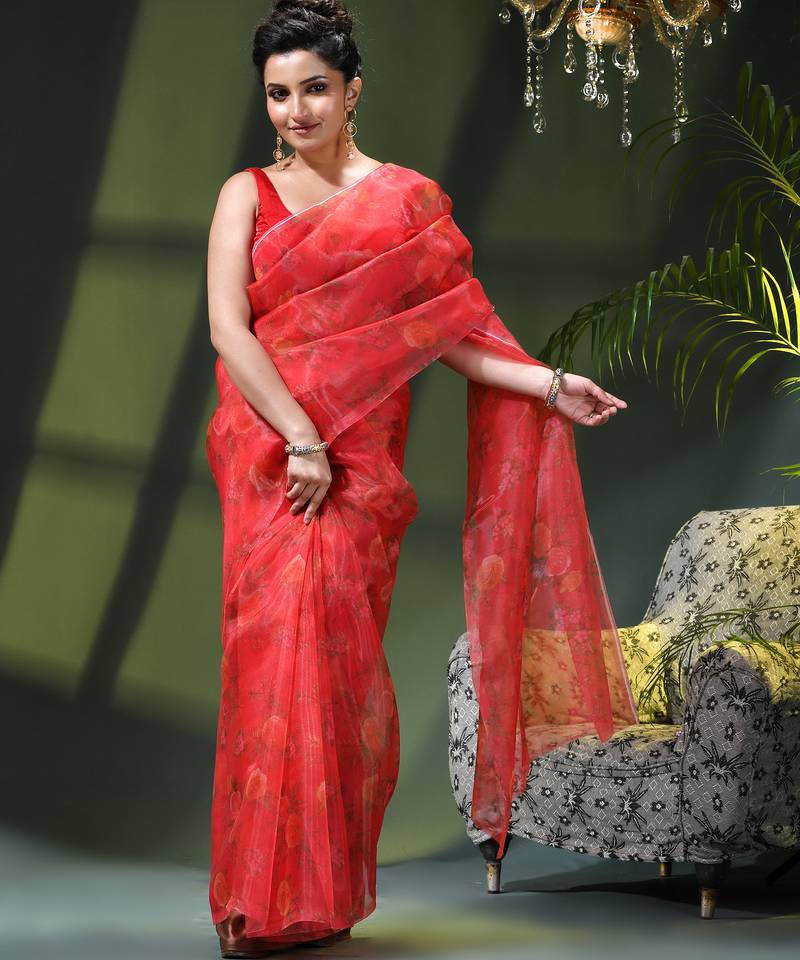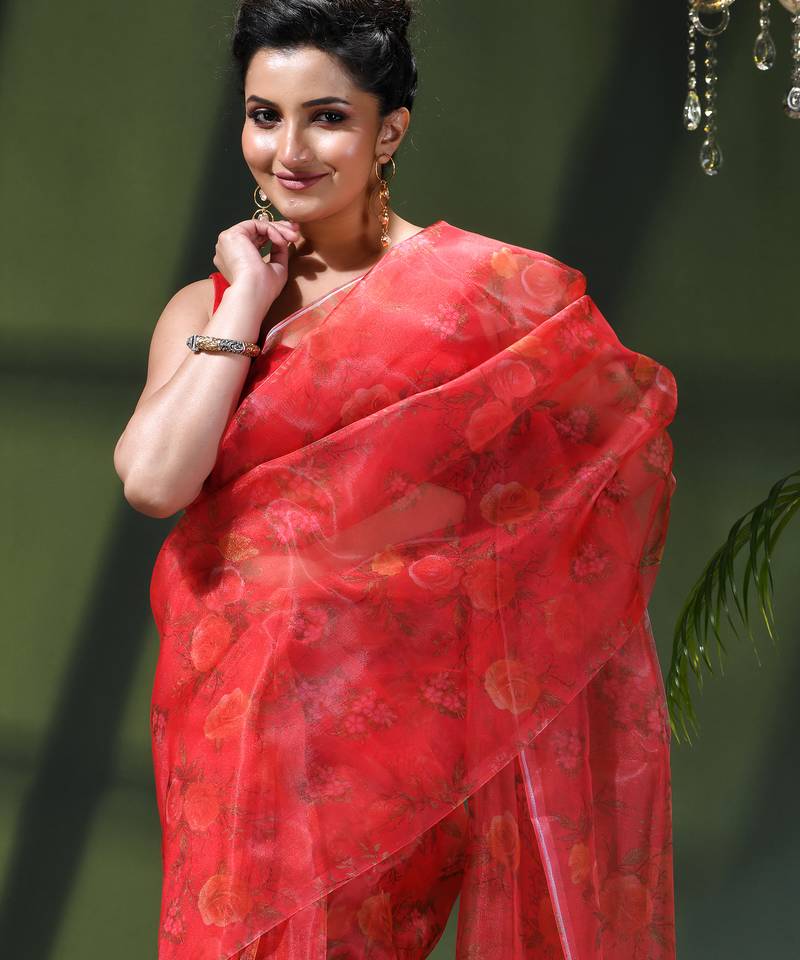 Women's printed organza sari trending rose leaf design fancy wedding saree for women