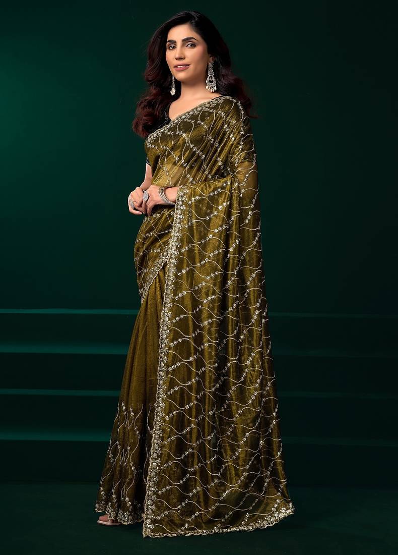 Green thread work net party wear saree with velvet blouse