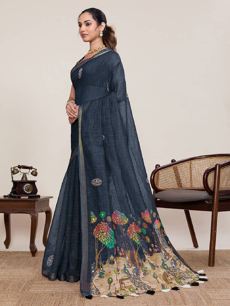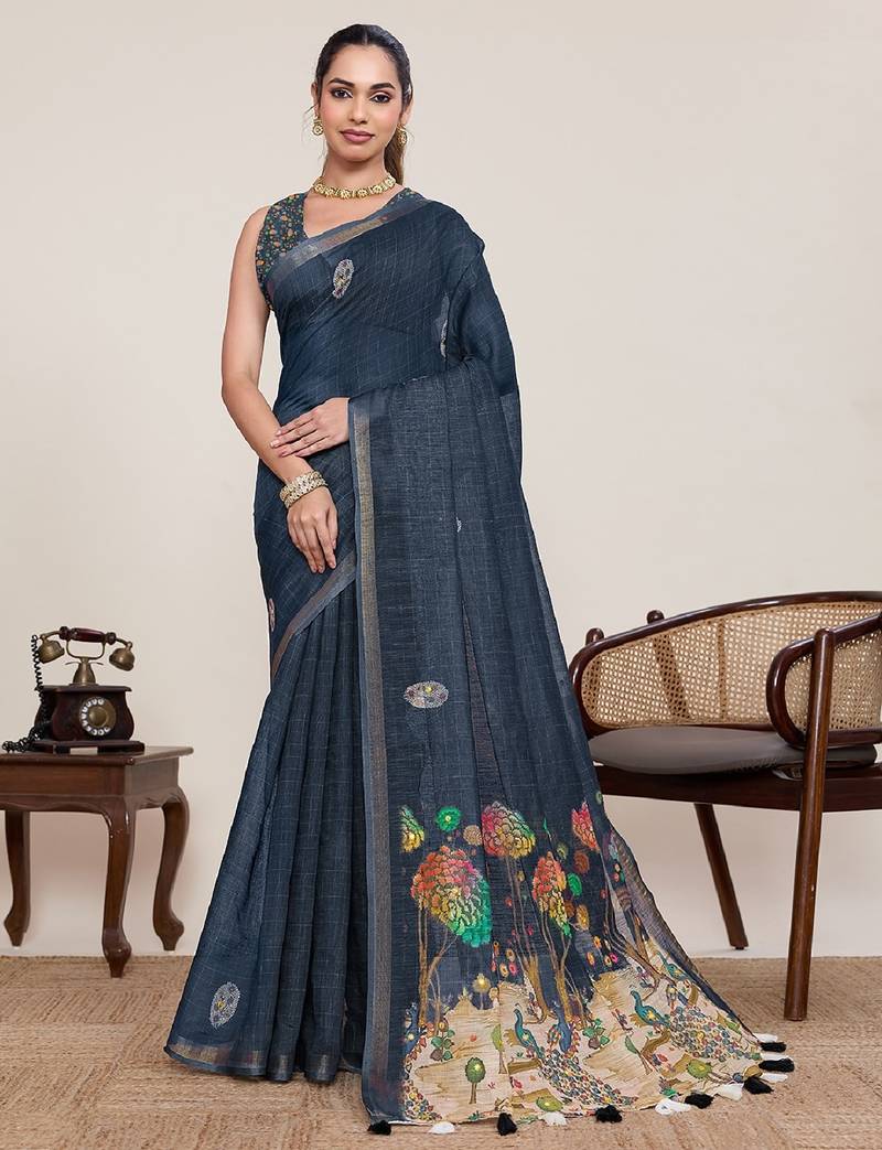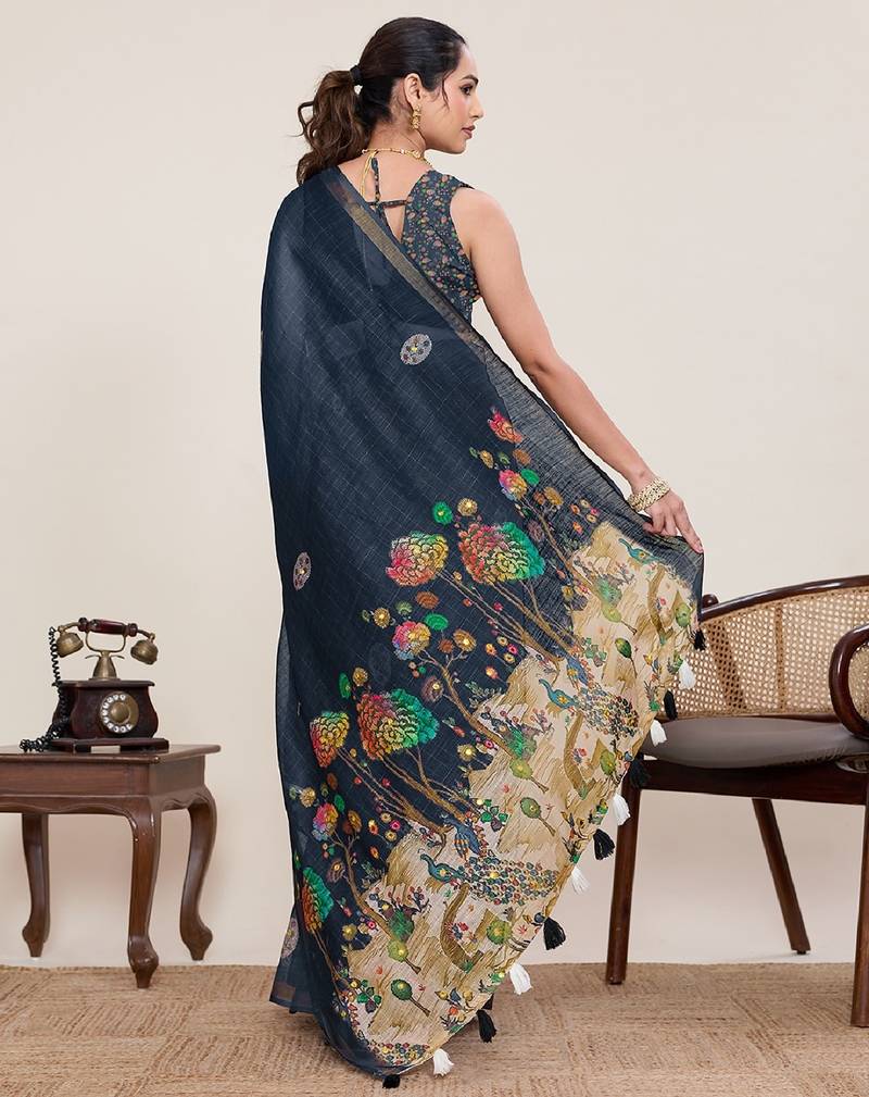 | Product Name | Navy Blue Printed Linen Designer Saree With Blouse | |
