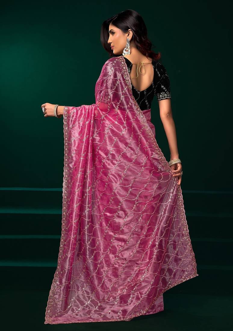 Pink thread work net party wear saree with velvet blouse