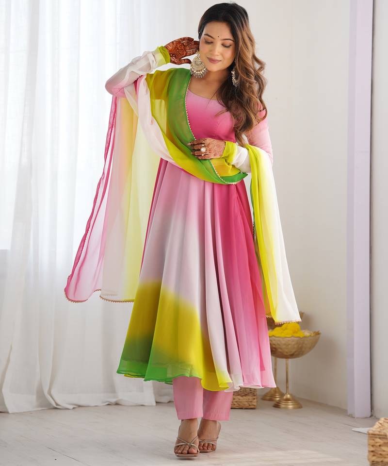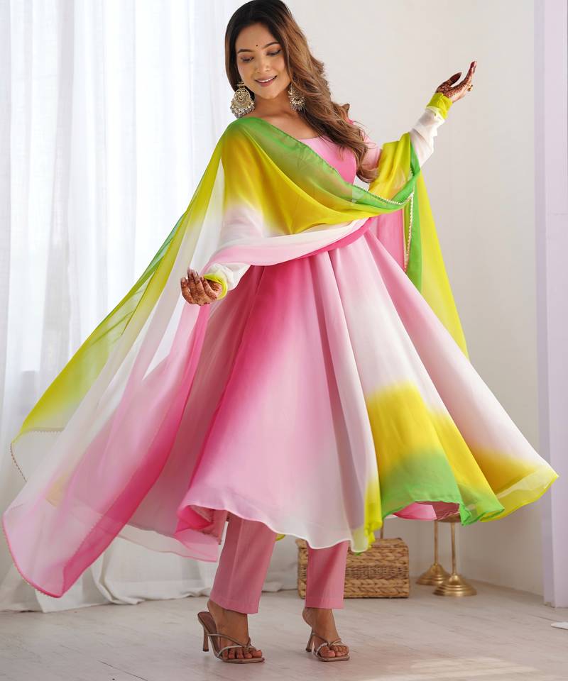 Product Name Pure Soft Fox Georgette Most Trendy Padding Fabric Fully Flair Anarkali,With Duppta Set,Pent Ready To Wear