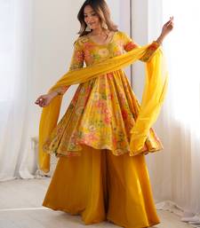 Pure soft romansilk chanderi discharge print fabric fully flair kediya style kurta,with duppta set,palazzo ready to wear stitched