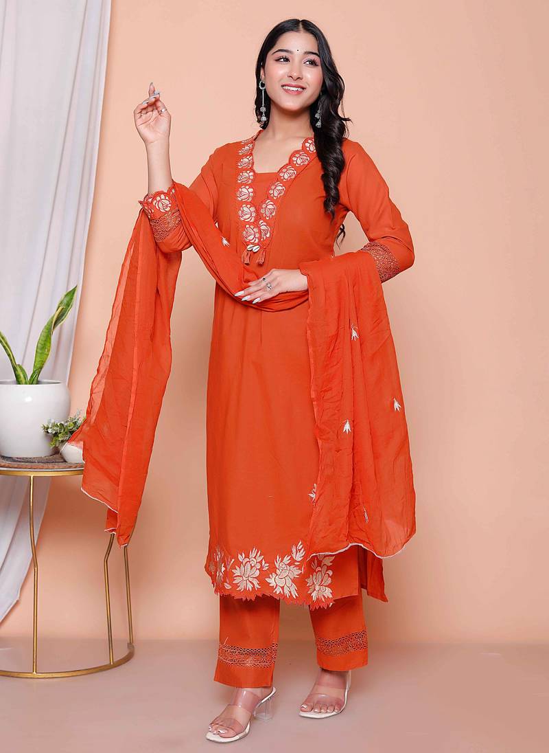 | Product Description | Rust Neck Embroidered Kurta With Palazzo And Dupatta Set, Straight Knee Length Kurta And Straight Hem, Has A V Neck, Three Quarter Regular Sleeves, Solid Palazzo Elasticated Waistband, Slip On Closure, Embroidered Dupatta, Has A Taping Border. |
