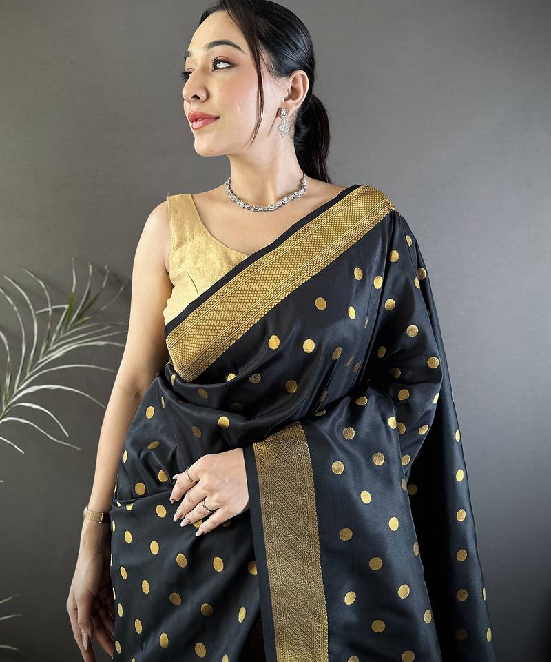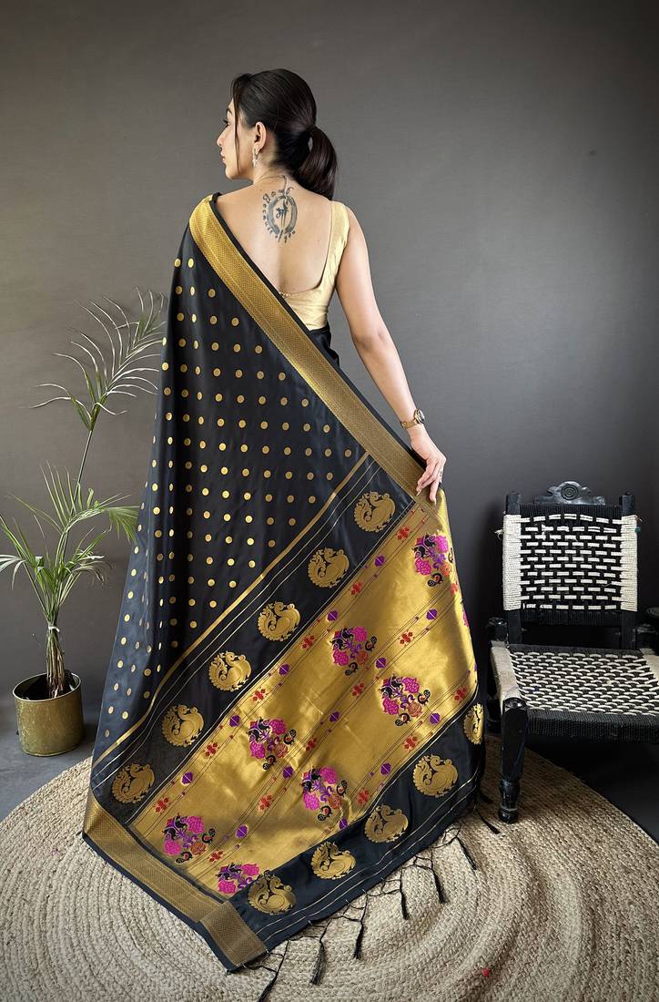 Black lichi silk blend peacock & floral motis zari weaving paithani saree