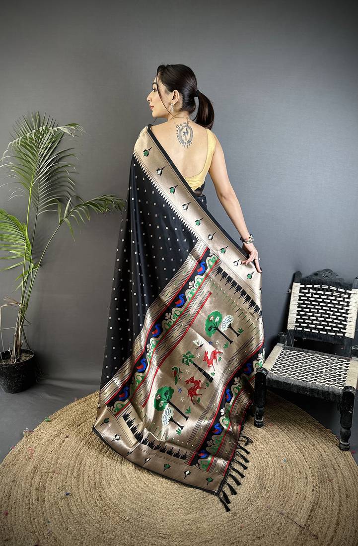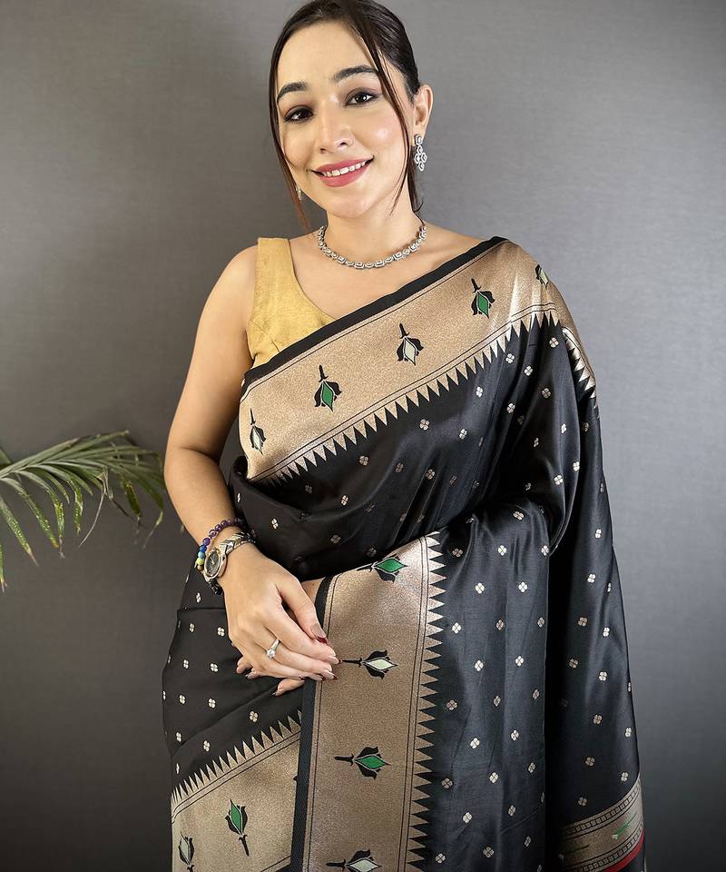 | Product Description | Black Soft Lichi Silk Peacock & Floral Motifs Jacquard Kanchipuram Saree A Striking Blend Of Rich Tradition And Modern Fashion From Our Most Popular Women’s Ethnic Wear Collection! Wrapped In Deep, Elegant Black, This Saree Dazzles With Exquisitely Woven Peacock And Floral Jacquard Motifs On Luxuriously Soft Lichi Silk Making It A Top Ranking Mirraw Design & Style That Trend Seekers Are Choosing Again And Again.