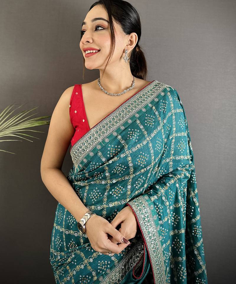 | Product Description | Emerald Blue Vichitra Silk Bandhej Bandhani With Stone & Sequence Work Saree Will Be A Perfect Addition To Your Ethnic Collection. Sarees Are Designed In House By Master Weaver And Made In Best Quality Fabric. This Premium Designer Saree Is Sure To Add Oodles Of Grace And Vibrant Colours To Your Personality. This Trendy, Appealing And Eye Catching Saree Is Perfect For Day Wear And Evening Wear For Any Occasion.