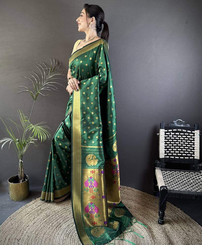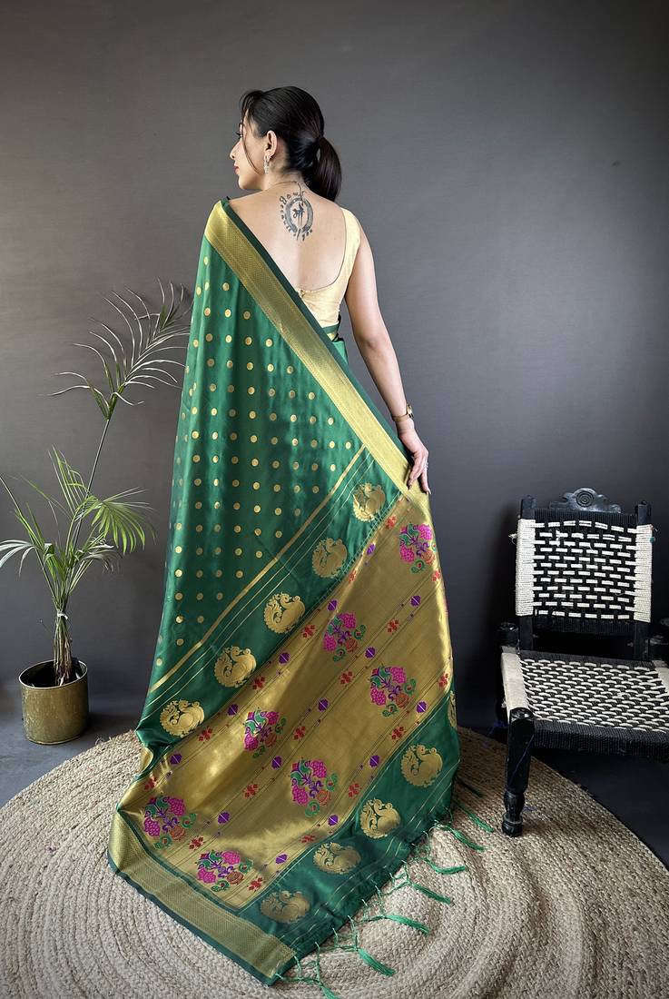 Green lichi silk blend peacock & floral motis zari weaving paithani saree