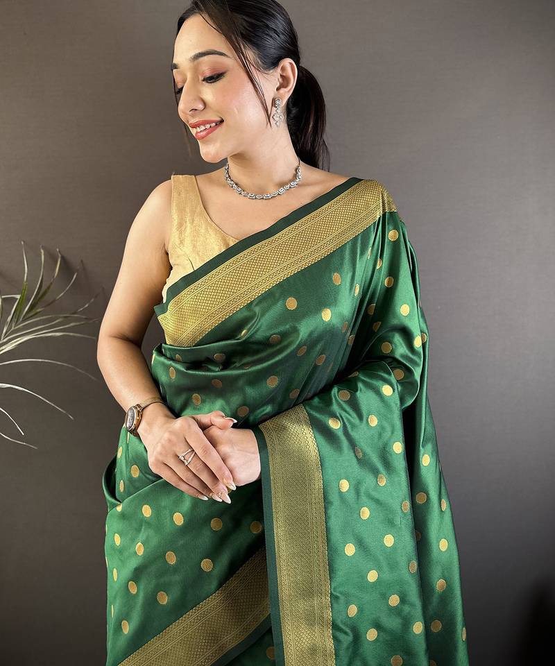| Product Description | Rev Up Your Ethnic Wardrobe With This Stunning Green Lichi Silk Paithani Saree, A True Staple In Women’s Ethnic Wear That’s Rising Fast As A Trending Bestseller On Mirraw. Its Lush Green Silk Base Is Beautifully Adorned With Exquisite Peacock And Floral Motifs Woven In Shimmering Zari, Giving You That Perfect Blend Of Timeless Tradition And Modern Sass. Whether It’s A Wedding, Festival, Or Any Joyous Celebration, This Piece Captures The Eye And Hearts Alike Making It One Of The Top‑Ranking Styles In Mirraw’s Most Loved Designs.