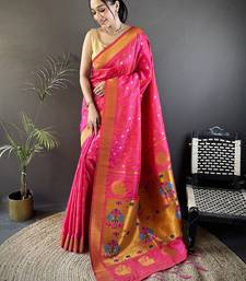 Hot pink lichi silk blend peacock & floral motis zari weaving paithani saree