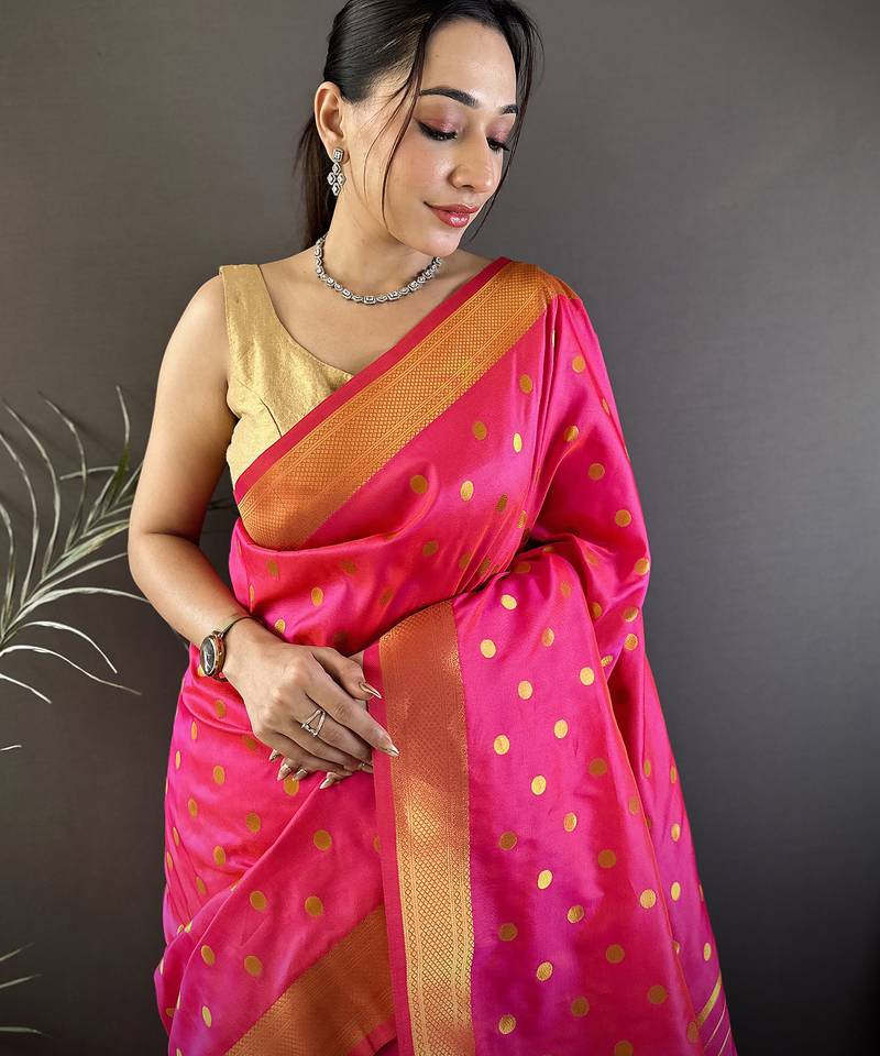| Product Description | Slay Every Festive Moment With This Hot Pink Lichi Silk Paithani Saree, A Vibrant Classic That’s Already Stealing The Spotlight Among Top Ranking Women’s Ethnic Wear On Mirraw. Wrapped In A Bold Hot Pink Hue That Radiates Joy And Celebration, This Saree Is Intricately Adorned With Traditional Peacock And Floral Motis Woven In Lustrous Zari, Showcasing Craftsmanship That’s Centuries‑Old And Forever Stylish. Paithani Sarees Are Treasured For Their Rich Silk And Detailed Motifs Like Peacocks And Floral Patterns, Making Them A Perfect Pick For Weddings, Festivals, And Grand Occasions.