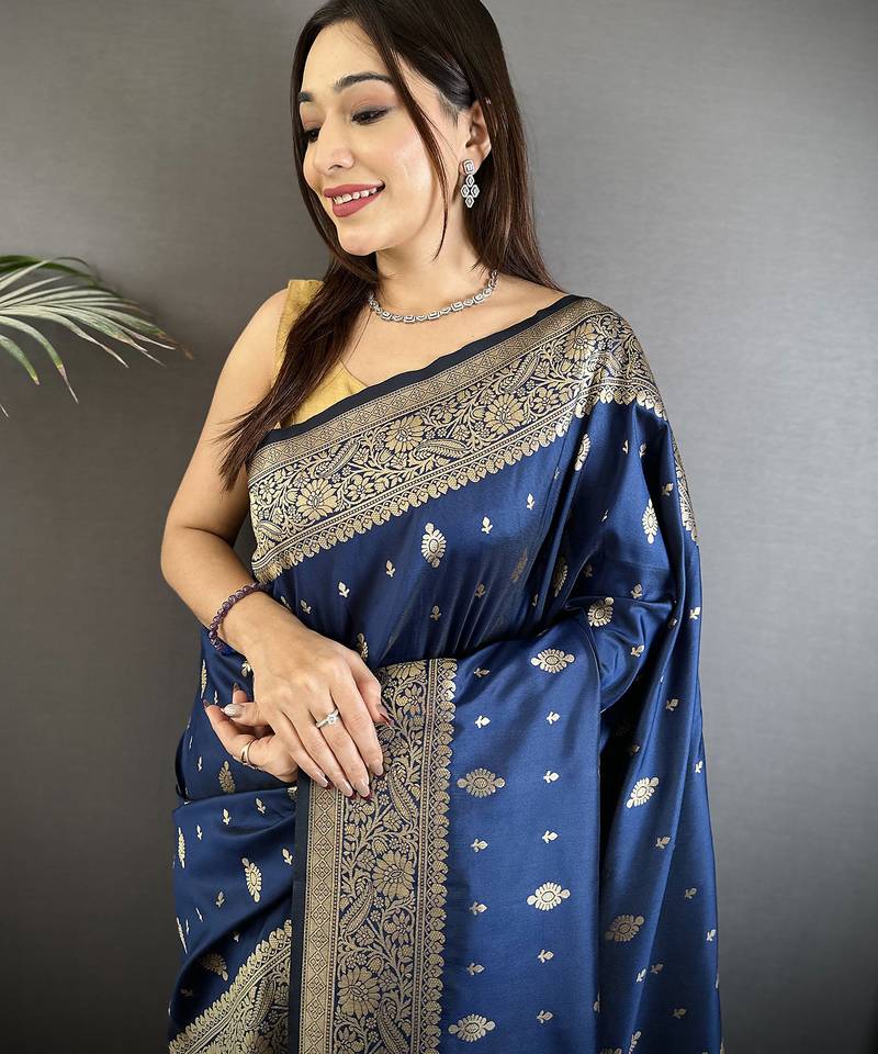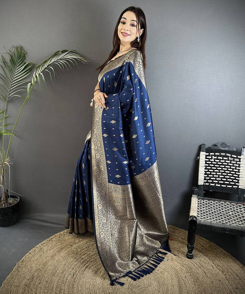 Navy blue lichi silk blend zari weaving motif banarasi saree