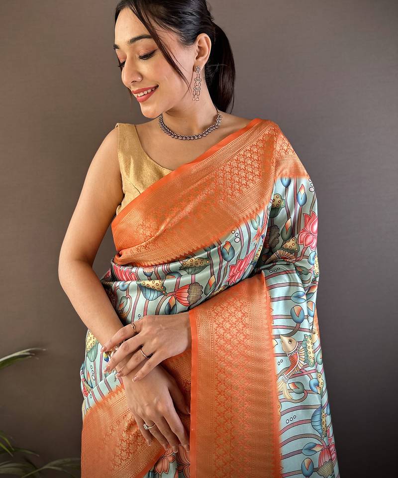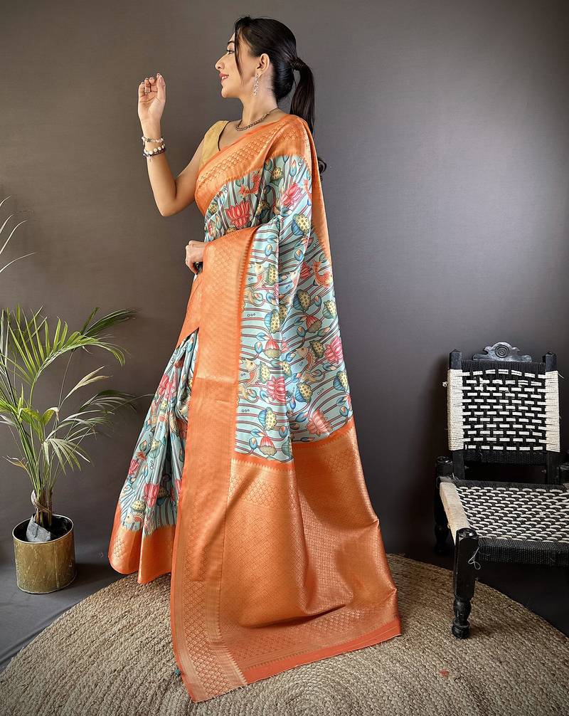 Product Name Orange Soft Lichi Silk Blend Multi Color Floral Digital Print Paithani Saree