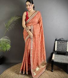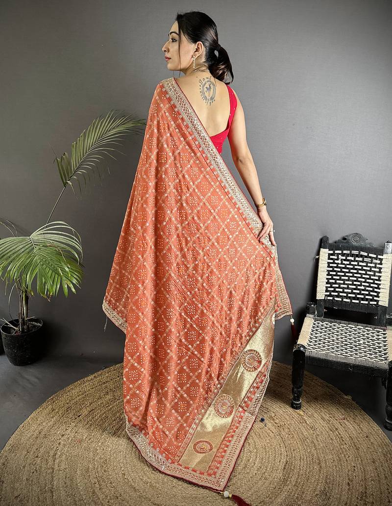 | Product Description | Peach Vichitra Silk Bandhej Bandhani With Stone & Sequence Work Saree Will Be A Perfect Addition To Your Ethnic Collection. Sarees Are Designed In House By Master Weaver And Made In Best Quality Fabric. This Premium Designer Saree Is Sure To Add Oodles Of Grace And Vibrant Colours To Your Personality. This Trendy, Appealing And Eye Catching Saree Is Perfect For Day Wear And Evening Wear For Any Occasion.