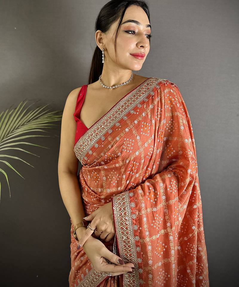 | Product Name | Peach Vichitra Silk Blend Bandhej Bandhani With Stone & Sequence Work Saree | |