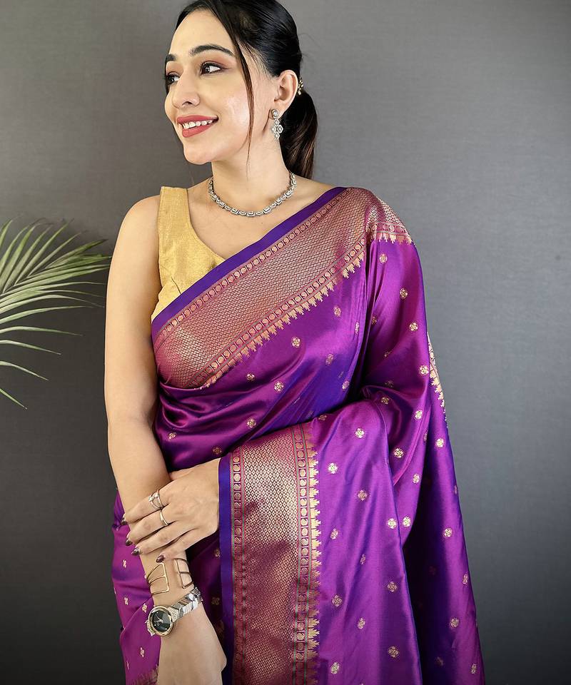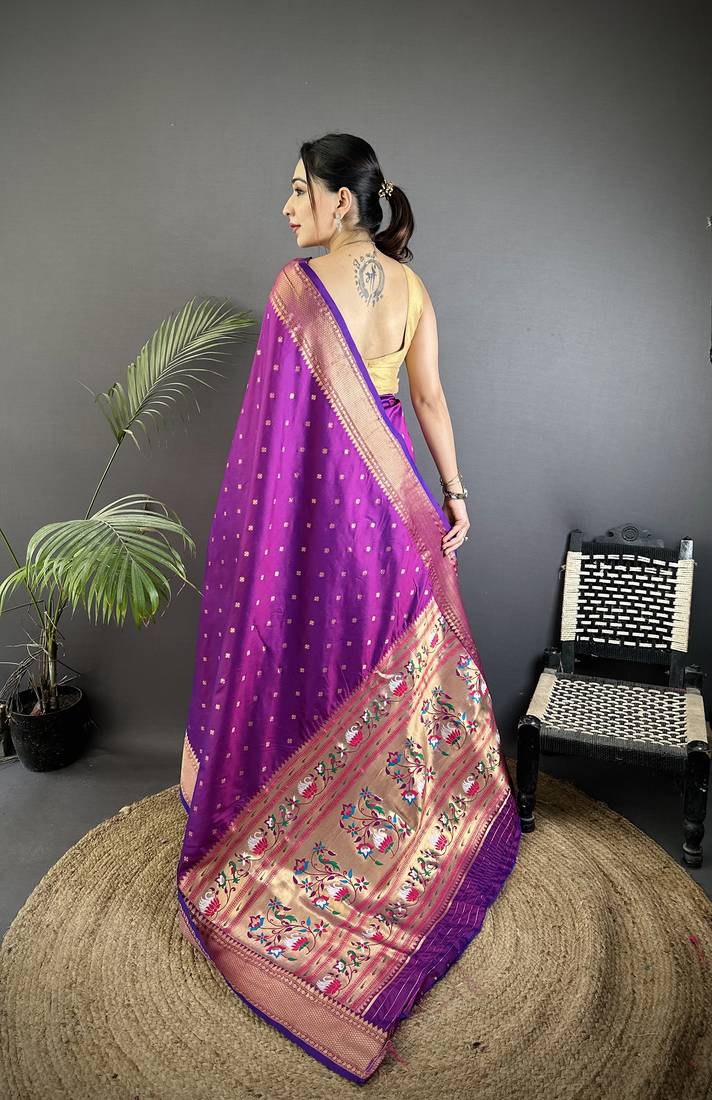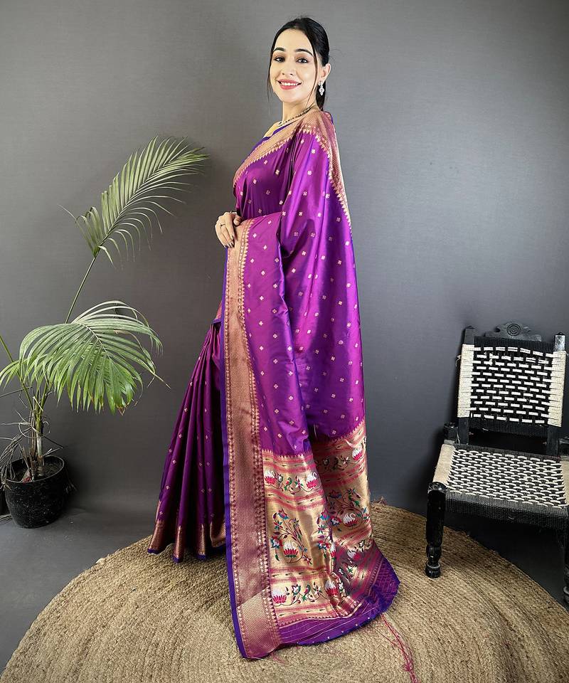 Purple soft lichi silk blend butti meenakari work paithani saree