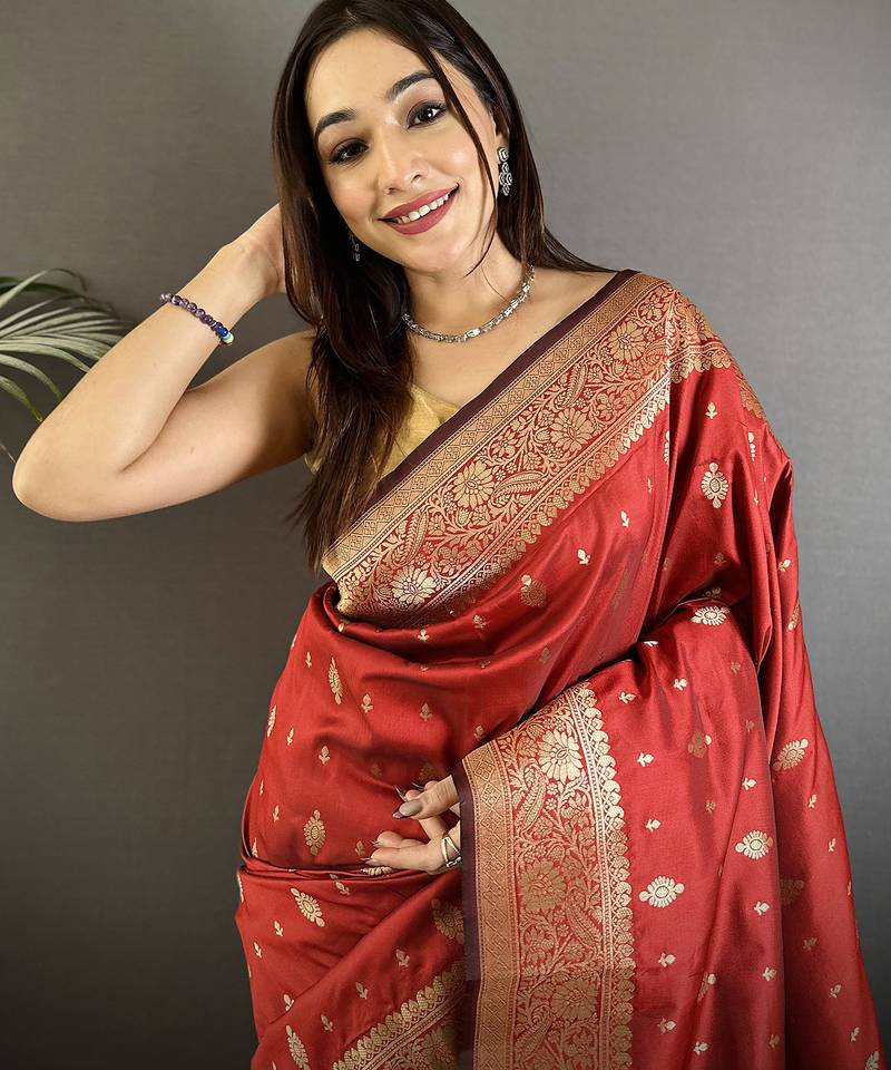 | Product Name | Red Lichi Silk Blend Zari Weaving Motif Banarasi Saree | |