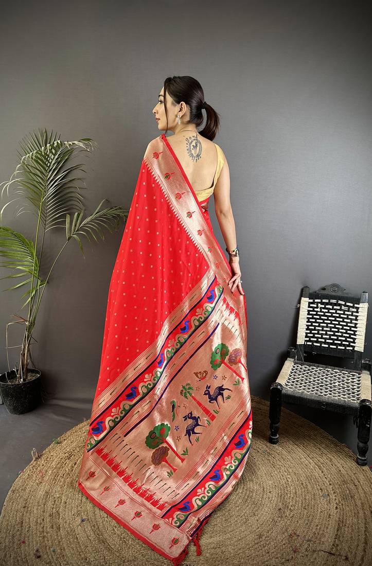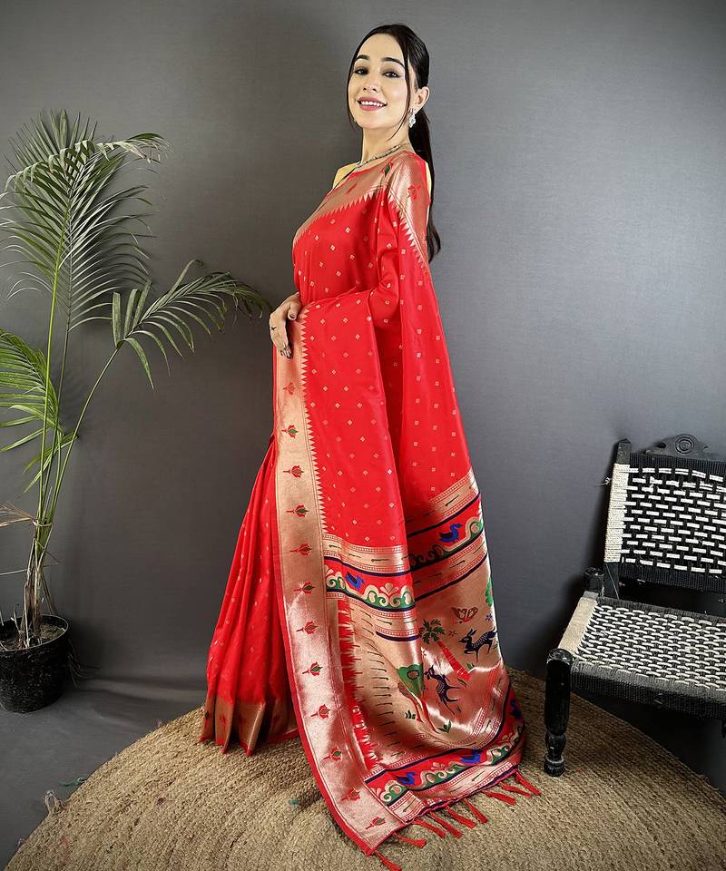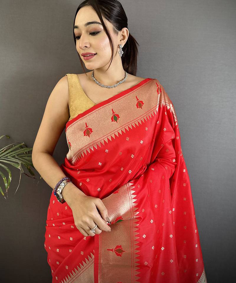 From The Mirraw Home Page To Trending Ethnic Style Feeds, This Saree Is A Trending & Most Popular Choice That Brightens Your Wardrobe With Vibrance And Flair. Add This Red Masterpiece To Your Collection And Let Your Style Radiate Confidence And Celebration Because Unforgettable Fashion Always Begins With The Perfect Saree.