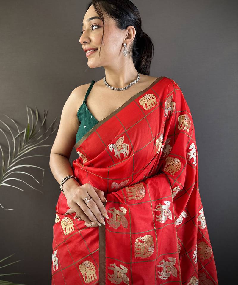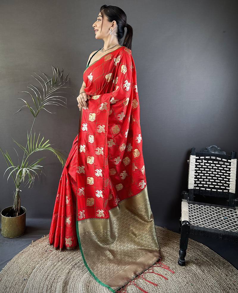 Red soft silk blend elephant motifs banarasi saree