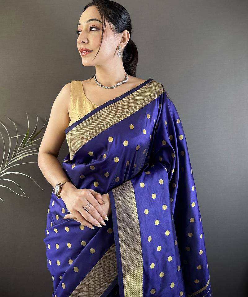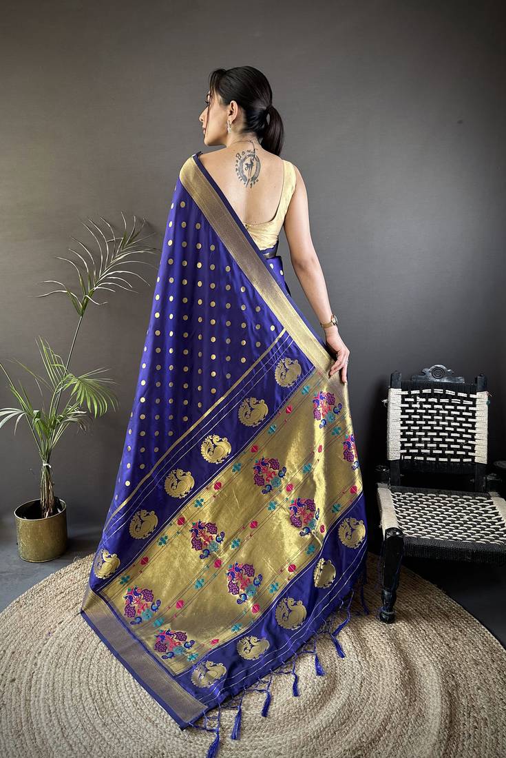 Royal blue lichi silk blend peacock & floral motis zari weaving paithani saree