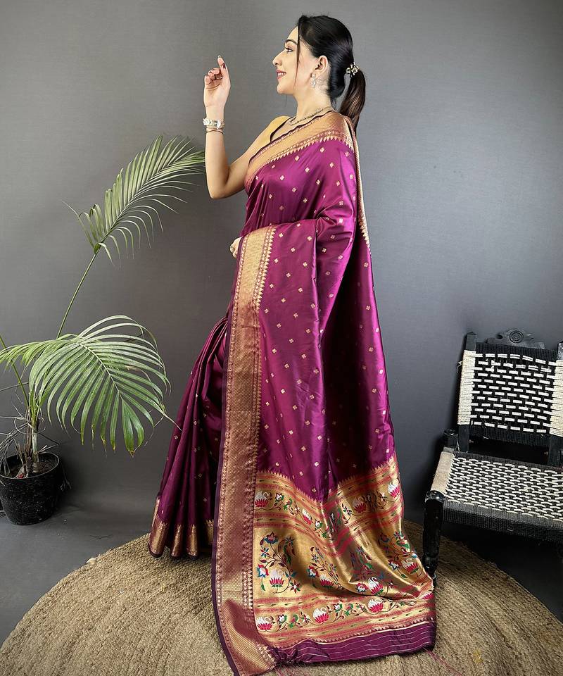 Wine soft lichi silk blend butti meenakari work paithani saree