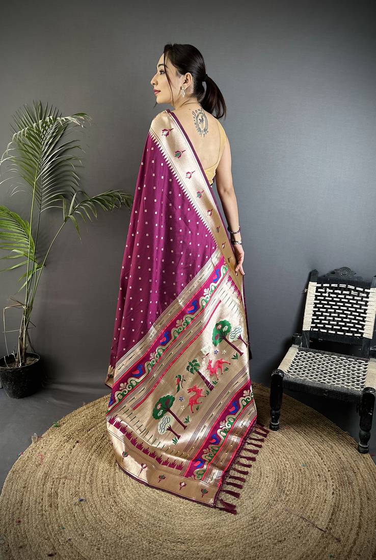 Wine soft lichi silk blend peacock & floral motifs jacquard kanchipuram saree
