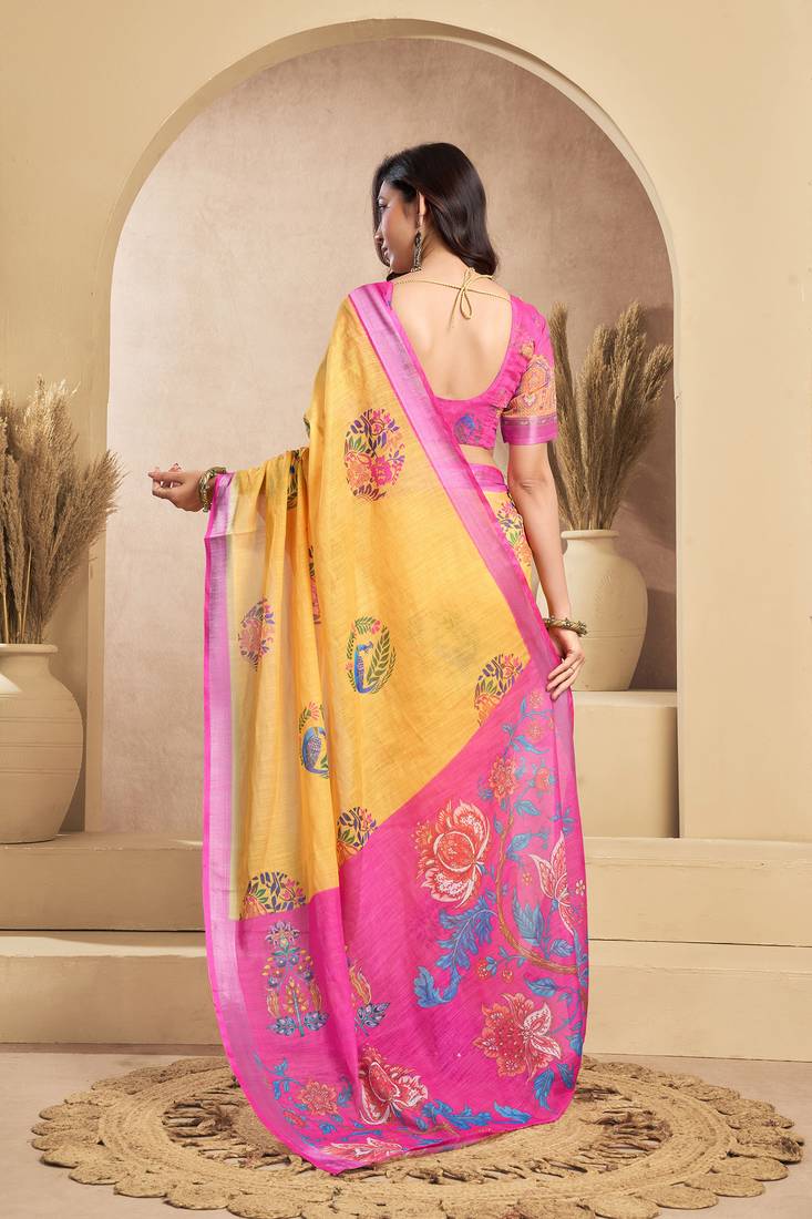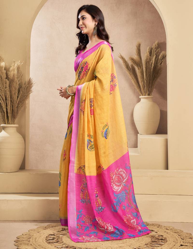 | Product Name | Yellow & Pink Linen Floral Printed Ready To Wear Saree | |