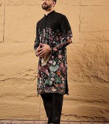 Men black georgette solid embroidered straight kurta